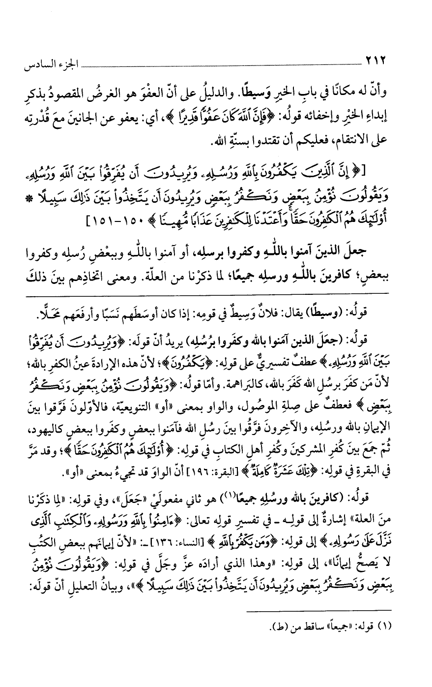 قوله: (كافرين بالله ورسله جميعا) هو ثاني مفعولي "جعل"، وفي قوله: "لما ذكرنا من العلة" إشارة إلى قوله- في تفسير قوله تعالى: {آمِنُوا بِاللَّهِ وَرَسُولِهِ وَالْكِتَابِ الَّذِي نَزَّلَ عَلَى رَسُولِهِ} إلى قوله: {وَمَنْ يَكْفُرْ بِاللَّهِ} [النساء: 136]-: "لأن إيمانهم ببعض الكتب لا يصح إيمانا"، إلى قوله: "وهذا الذي أراده عز وجل في قوله: {وَيَقُولُونَ نُؤْمِنُ بِبَعْضٍ وَنَكْفُرُ بِبَعْضٍ وَيُرِيدُونَ أَنْ يَتَّخِذُوا بَيْنَ ذَلِكَ سَبِيلاً} "، وبيان التعليل أن قوله: