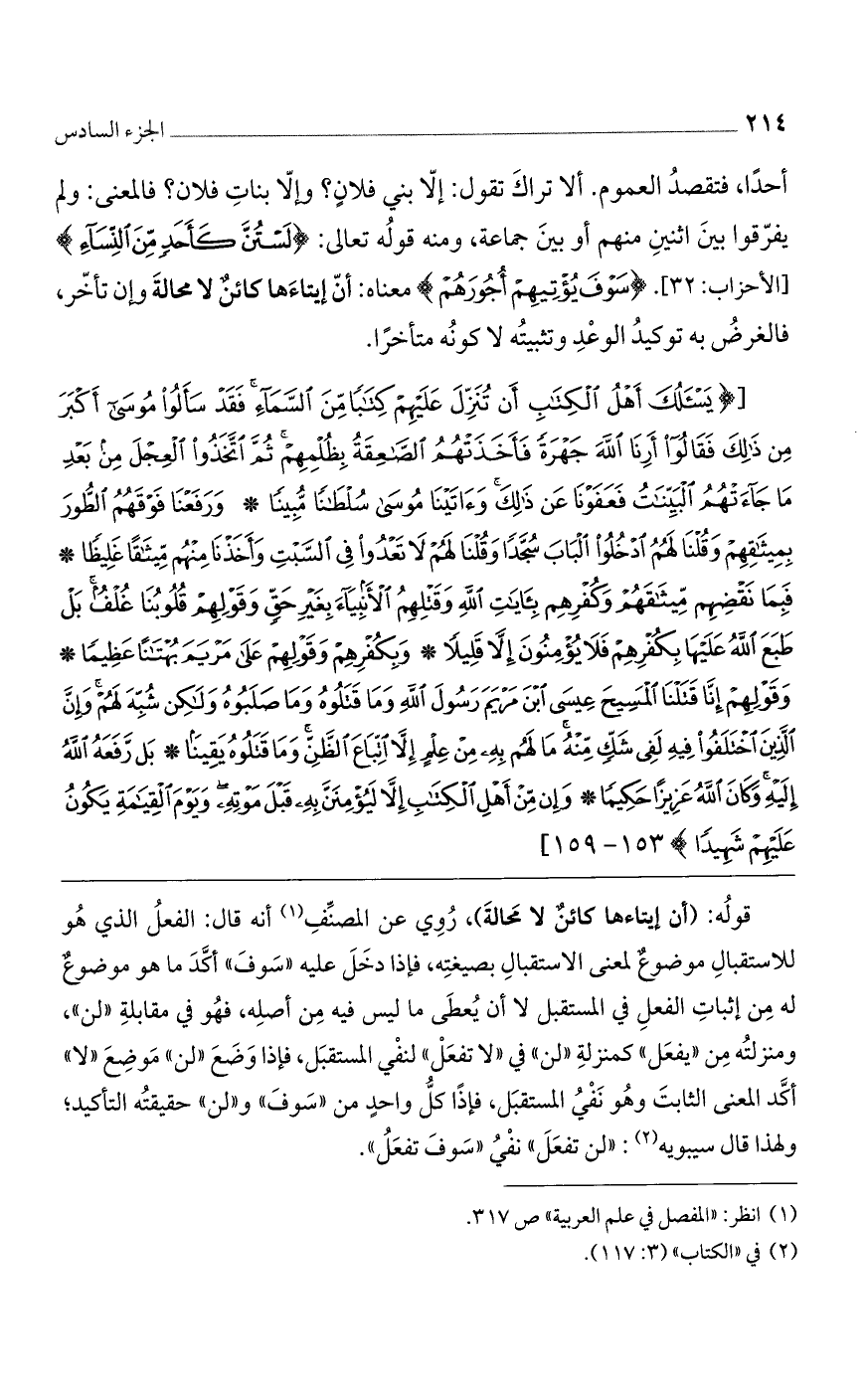 أحداً، فتقصد العموم، ألا تراك تقول: إلا بني فلان؟ وإلا بنات فلان؟ فالمعنى: ولم يفرقوا بين اثنين منهم أو بين جماعة، ومنه قوله تعالى: (لَسْتُنَّ كَأَحَدٍ مِنَ النِّساءِ) [الأحزاب: 32]. (سَوْفَ يُؤْتِيهِمْ أُجُورَهُمْ) معناه: أنّ إيتاءها كائن لا محالة وإن تأخر فالغرض به توكيد الوعد وتثبيته لا كونه متأخراً.