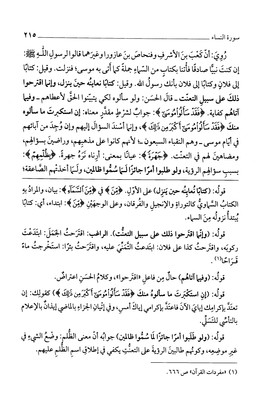 روي: أنّ كعب بن الأشرف وفنحاص بن عازورا وغيرهما قالوا لرسول اللَّه صلى اللَّه عليه وسلم: إن كنت نبياً صادقاً فأتنا بكتابٍ من السماء جملةً كما أتى به موسى. فنزلت. وقيل: كتاباً إلى فلان وكتاباً إلى فلان أنك رسول اللَّه، وقيل: كتاباً نعاينه حين ينزل، وإنما اقترحوا ذلك على سبيل التعنت- قال الحسن: ولو سألوه لكي يتبينوا الحق لأعطاهم- وفيما آتاهم كفاية. (فَقَدْ سَأَلُوا مُوسى): جواب لشرطٍ مقدرٍ معناه: إن استكبرت ما سألوه منك (فَقَدْ سَأَلُوُا مُوسَى أَكْبَرَ مِنْ ذلِكَ)، وإنما أسند السؤال إليهم وإن وجد من آبائهم في أيام موسى - وهم النقباء - السبعون، لأنهم كانوا على مذهبهم، وراضين بسؤالهم، ومضاهين لهم في التعنت. (جَهْرَةً): عياناً بمعنى: أرناه نره جهرة. (بِظُلْمِهِمْ): بسبب سؤالهم الرؤية، ولو طلبوا أمراً جائزاً لما سموا ظالمين ولما أخذتهم الصاعقة،