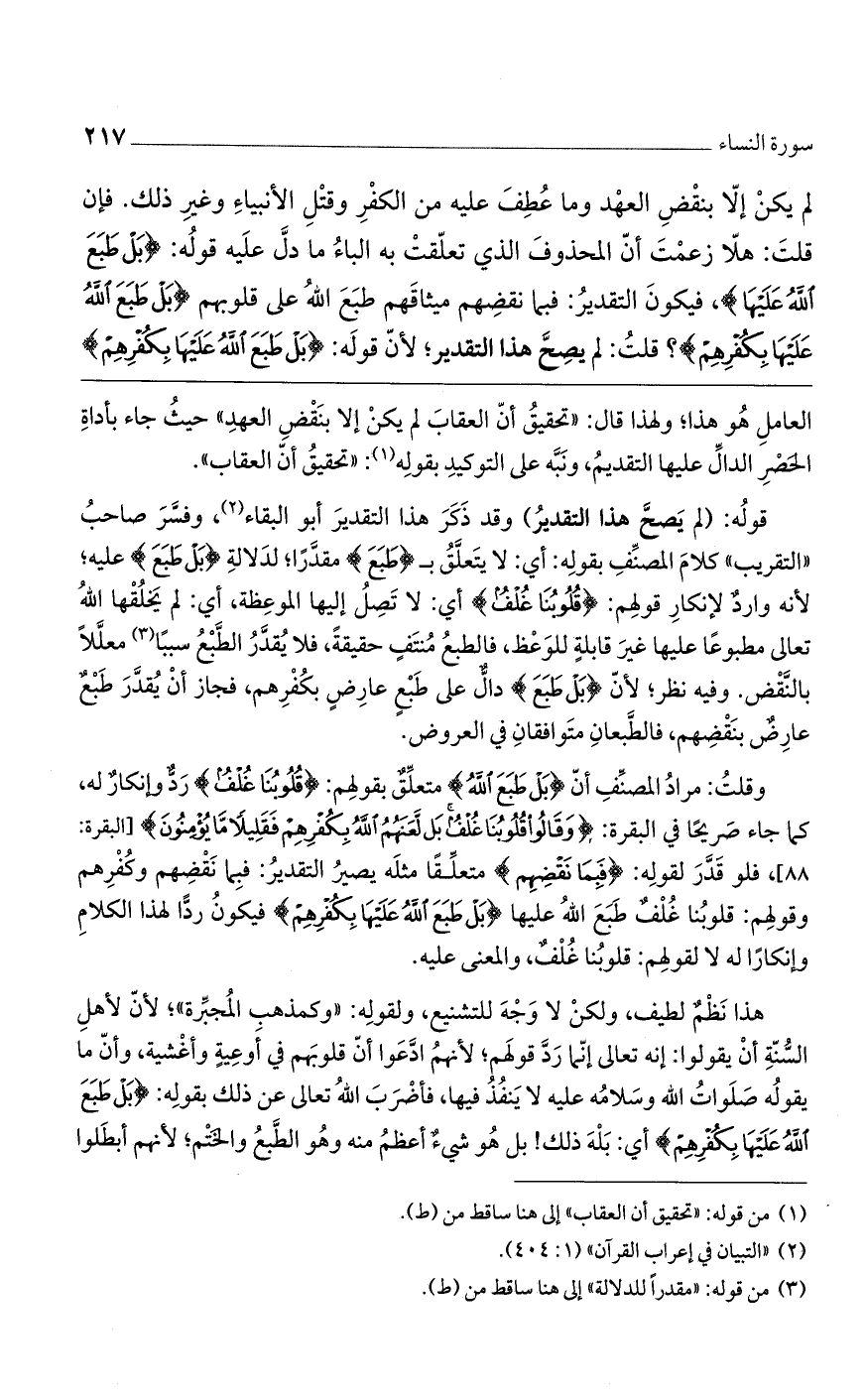 وقلت: مرادف المصنف أن {بَلْ طَبَعَ اللَّهُ} متعلق بقولهم: {قُلُوبُنَا غُلْفٌ} رد وإنكار له، كما جاء صريحاً في البقرة: {وَقَالُوا قُلُوبُنَا غُلْفٌ بَلْ لَعَنَهُمْ اللَّهُ بِكُفْرِهِمْ فَقَلِيلاً مَا يُؤْمِنُونَ} [البقرة: 88]، فلو قدر لقوله: {فَبِمَا نَقْضِهِمْ} متعلقاً مثله يصير التقدير: فبما نقضهم وكفرهم وقولهم: قلوبنا غُلف طبع الله عليها {بَلْ طَبَعَ اللَّهُ عَلَيْهَا بِكُفْرِهِمْ} فيكون رداً لهذا الكلام وإنكاراً له لا لقولهم: قلوبنا غلفٌن والمعنى عليه.