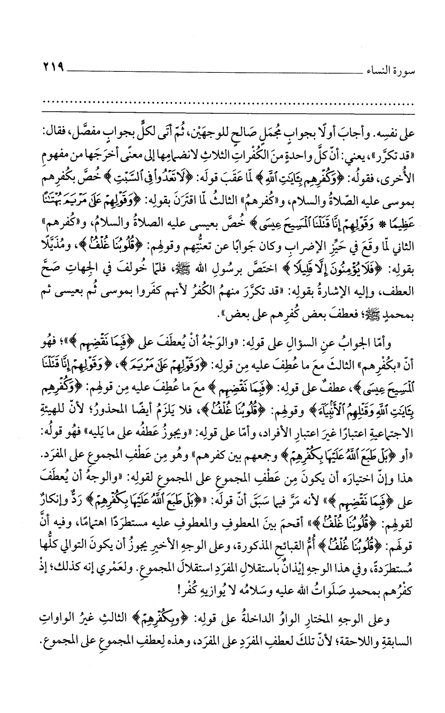 وأما الجواب عن السؤال على قوله: "والوجه أن يعطف على {فَبِمَا نَقْضِهِمْ} "؛ فهو أن "بكفرهم" الثالث مع ما عطف عليه من قوله: {وَقَوْلِهِمْ عَلَى مَرْيَمَ}، {وَقَوْلِهِمْ إِنَّا قَتَلْنَا الْمَسِيحَ عِيسَى}، عطف على قوله: {فَبِمَا نَقْضِهِمْ} مع ما عُطف عليه من قولهم: {وَكُفْرِهِمْ بِآيَاتِ اللَّهِ وَقَتْلِهِمْ الأَنْبِيَاءَ} وقولهم: {قُلُوبُنَا غُلْفٌ}، فلا يلزم أيضاً المحذور؛ لأن للهيئة الاجتماعية اعتباراً غير اعتبار الأفراد، وأما على قوله: "ويجوز عطفه على ما يليه" فهو قوله: "أو {بَلْ طَبَعَ اللَّهُ عَلَيْهَا بِكُفْرِهِمْ} ومعهم بين كفرهم" وهو من عطف المجموع على المفرد. هذا وإن اختياره أن يكون من عطف المجموع على المجموع لقوله: "والوجه أن يُعطف على {فَبِمَا نَقْضِهِمْ} " لأنه مر فيما سبق أن قوله: " {بَلْ طَبَعَ اللَّهُ عَلَيْهَا بِكُفْرِهِمْ} ردُّ وإنكار لقولهم: {قُلُوبُنَا غُلْفٌ} أقحم بين المعطوف والمعطوف عليه مستطرداً اهتماماً، وفيه أن قولهم: {قُلُوبُنَا غُلْفٌ} أم القبائح المذكورة، وعلى الوجه الأخير يجوز أن يكون التوالي كلها مستطردة، وفي هذا الوجه إيذانٌ باستقلال المفرد استقلال المجموع. ولعمري إنه كذلك؛ إذ كفرهم بمحمد صلوات الله عليه وسلامه لا يوازيه كفر!