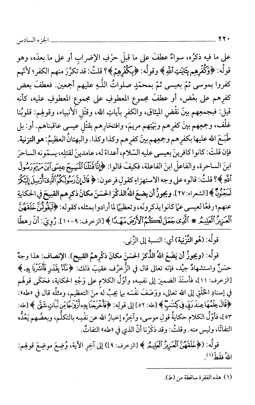 قوله: (ويجوز أن يضع الله الذكر الحسن مكان ذكرهم القبيح). الإنصاف: هذا وجهٌ حسنٌ واستشهادٌ جيد، فإنه تعالى قال في الزخرف عقيب ذلك: {قَالَ عِلْمُهَا عِنْدَ رَبِّي فِي كِتَابٍ} [طه: 52] إلى قوله: {فَأَخْرَجْنَا بِهِ أَزْوَاجاً مِنْ نَبَاتٍ شَتَّى} [طه: 53]، فأول الكلام حكاية قول موسى، وآخره إخبار الله عن نفسه بالتكلم، وبعضهم يعده التفاتاً، وليس منه. وقلت: وقد ذكرنا أن الذي في "طه" التفات.