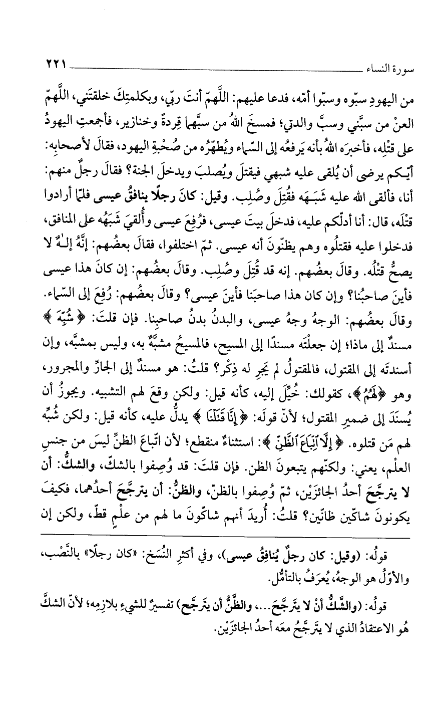 وقال بعضهم: الوجه وجه عيسى، والبدن بدن صاحبنا. فإن قلت: (شُبِّهَ) مسند إلى ماذا؛ إن جعلته مسنداً إلى المسيح، فالمسيح مشبه به، وليس بمشبه، وإن أسندته إلى المقتول، فالمقتول لم يجر له ذكر؟ قلت: هو مسندٌ إلى الجار والمجرور، وهو (لَهُمُ)، كقولك: خُيل إليه، كأنه قيل: ولكن وقع لهم التشبيه. ويجوز أن يسند إلى ضمير المقتول؛ لأنّ قوله: (إنا قتلنا) يدل عليه، كأنه قيل: ولكن شبه لهم من قتلوه. (إِلَّا اتِّباعَ الظَّنِّ): استثناء منقطع؛ لأنّ اتباع الظن ليس من جنس العلم، يعني: ولكنهم يتبعون الظن. فإن قلت: قد وصفوا بالشك، والشك: أن لا يترجح أحد الجائزين، ثم وصفوا بالظن، والظن: أن يترجح أحدهما، فكيف يكونون شاكين ظانين؟ قلت: أريد أنهم شاكون ما لهم من علم قط، ولكن إن