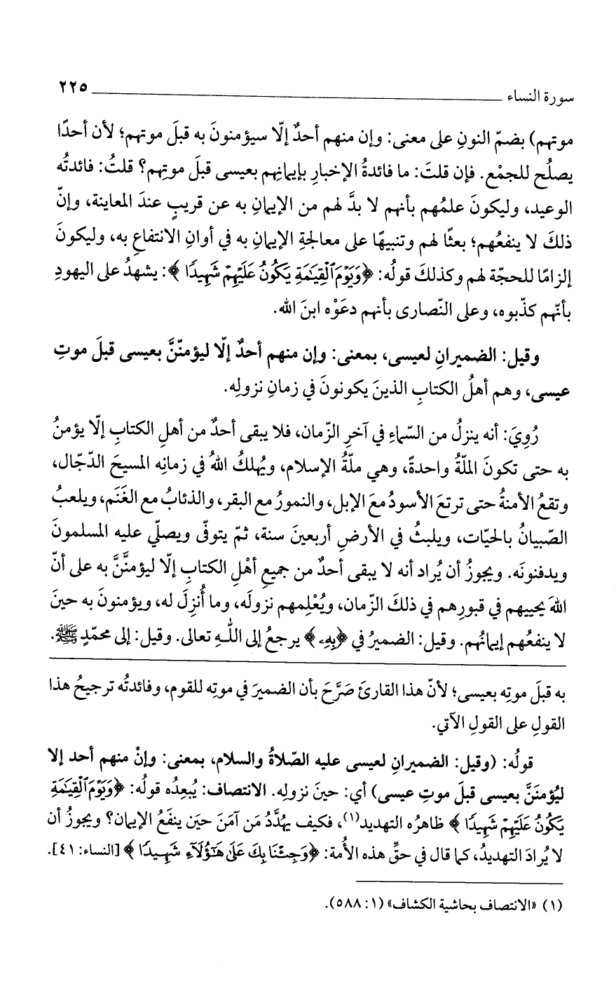 موتهم) بضم النون على معنى: وإن منهم أحد إلا سيؤمنون به قبل موتهم، لأنّ أحداً يصلح للجمع. فإن قلت: ما فائدة الإخبار بإيمانهم بعيسى قبل موتهم؟ قلت: فائدته الوعيد، وليكون علمهم بأنهم لا بدّ لهم من الإيمان به عن قريب عند المعاينة، وأن ذلك لا ينفعهم؛ بعثاً لهم وتنبيهاً على معاجلة الإيمان به في أوان الانتفاع به، وليكون إلزاماً للحجة لهم، وكذلك قوله: (وَيَوْمَ الْقِيامَةِ يَكُونُ عَلَيْهِمْ شَهِيداً): يشهد على اليهود بأنهم كذبوه، وعلى النصارى بأنهم دعوه ابن اللَّه.