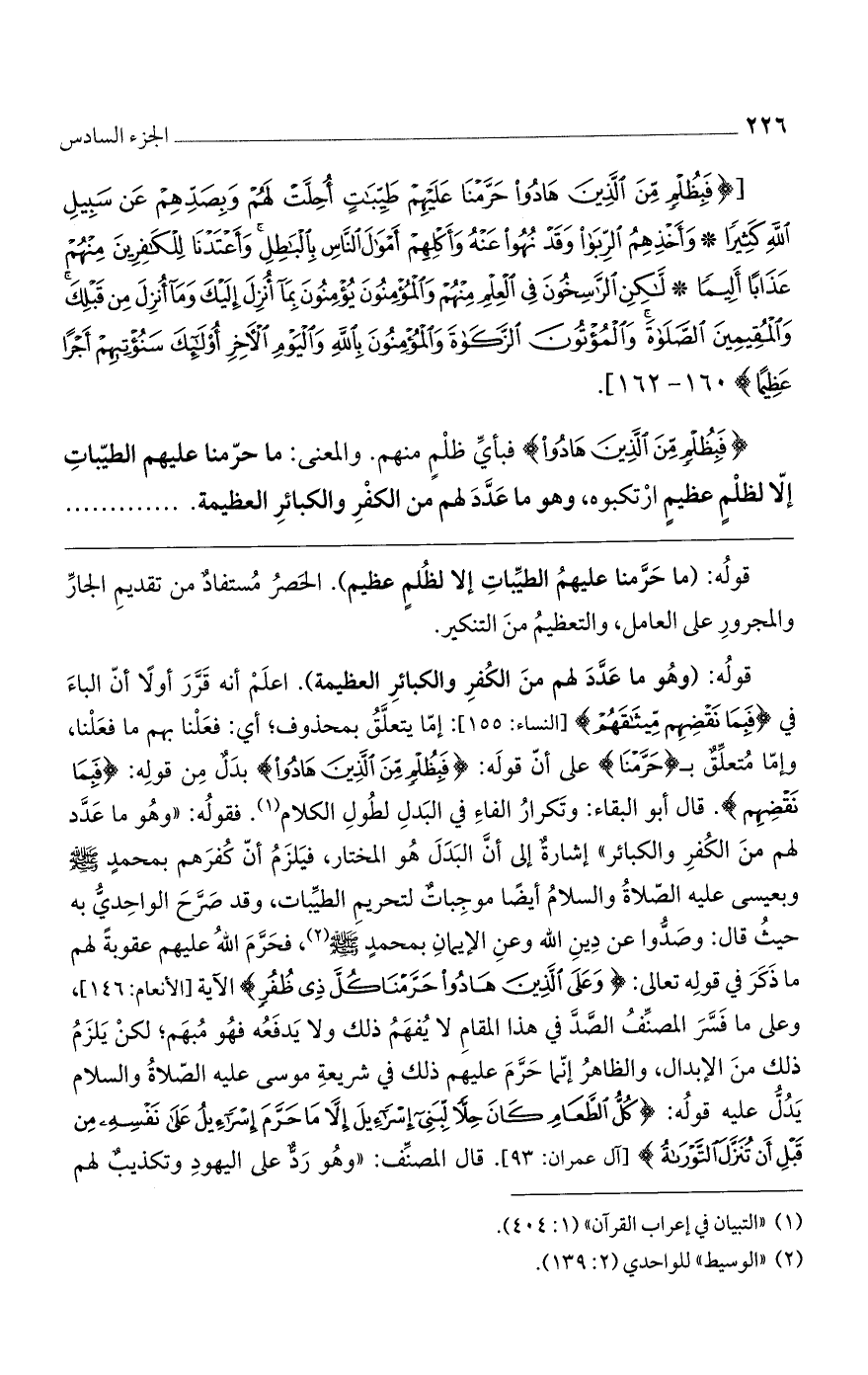[(فَبِظُلْمٍ مِنَ الَّذِينَ هادُوا حَرَّمْنا عَلَيْهِمْ طَيِّباتٍ أُحِلَّتْ لَهُمْ وَبِصَدِّهِمْ عَنْ سَبِيلِ اللَّهِ كَثِيراً (160) وَأَخْذِهِمُ الرِّبَوا وَقَدْ نُهُوا عَنْهُ وَأَكْلِهِمْ أَمْوالَ النَّاسِ بِالْباطِلِ وَأَعْتَدْنا لِلْكافِرِينَ مِنْهُمْ عَذاباً أَلِيماً (161) لكِنِ الرَّاسِخُونَ فِي الْعِلْمِ مِنْهُمْ وَالْمُؤْمِنُونَ يُؤْمِنُونَ بِما أُنْزِلَ إِلَيْكَ وَما أُنْزِلَ مِنْ قَبْلِكَ وَالْمُقِيمِينَ الصَّلاةَ وَالْمُؤْتُونَ الزَّكاةَ وَالْمُؤْمِنُونَ بِاللَّهِ وَالْيَوْمِ الْآخِرِ أُولئِكَ سَنُؤْتِيهِمْ أَجْراً عَظِيماً)].