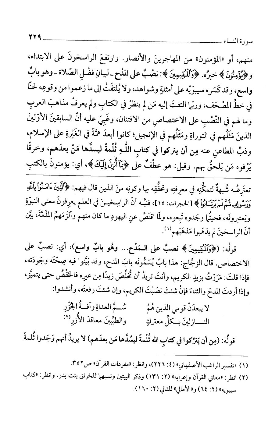 قوله: ({وَالْمُقِيمِينَ} نصبٌ على المدح ... وهو باب واسع)، أي: نصبٌ على الاختصاص. قال الزجاج: هذا باب يسمونه باب المدح، وقد بينوا فيه صحته وجودته، فإذا قلت: مررت بزيد الكريم، وأنت تريد أن تُخلص زيداً من غيره فالخفض حتى يتميز، وإذا أردت المدح والثناء فإن شئت نصبت الكريم، وإن شئت رفعته، وأنشدوا: