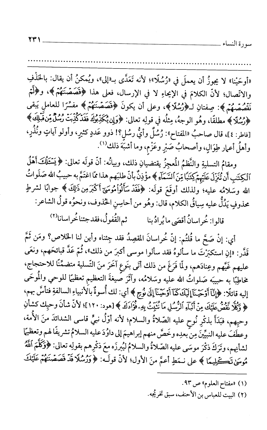 "أوحينا" لا يجوز أن يعمل في "رُسُلاً"؛ لأنه تعدى بـ "إلى"، ويُمكن أن يقال: بالحذف والاتصال؛ لأن الكلام في الإيحاء لا في الإرسال، فعلى هذا {قَصَصْنَاهُمْ}، و {لَمْ نَقْصُصْهُمْ}: صفتان لـ {رُسُلاً}، وعلى أن يكون {قَصَصْنَاهُمْ} مفسراً للعامل يبقى {رُسُلاً} مطلقاً، وهو الوجه، مثله في قوله تعالى: {وَإِنْ يُكَذِّبُوكَ فَقَدْ كُذِّبَتْ رُسُلٌ مِنْ قَبْلِكَ} [فاطر: 4]، قال صاحب "المفتاح": رُسُلٌ وأي رسل؟ ! ذوو عددٍ كثير، وأولو آيات ونُذرٍ، وأهل أعمار طوال، وأصحاب صبرٍ وعزمٍ، وما أشبه ذلك.