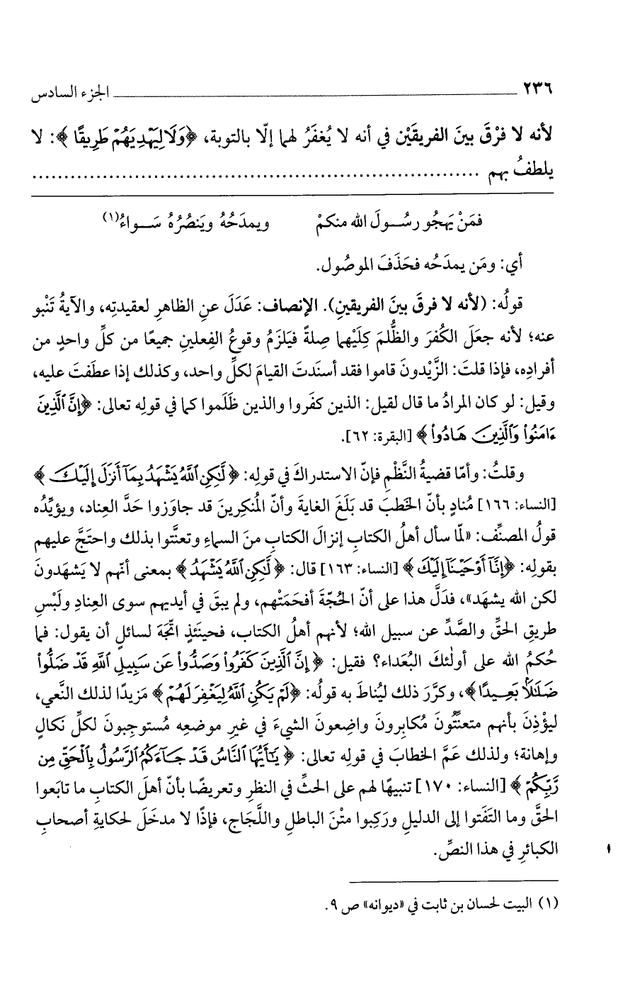 وقلت: وأما قضية النظم فإن الاستدراك في قوله: {لَكِنْ اللَّهُ يَشْهَدُ بِمَا أَنزَلَ إِلَيْكَ} [النساء: 166] مُنادٍ بأن الخطب قد بلغ الغاية وأن المنكرين قد جاوزوا حد العناد، ويؤيده قول المصنف: "لما سأل أهل الكتاب إنزال الكتاب من السماء وتعنتوا بذلك واحتج عليهم بقوله: {إِنَّا أَوْحَيْنَا إِلَيْكَ} [النساء: 163] قال: {لَكِنْ اللَّهُ يَشْهَدُ} بمعنى أنهم لا يشهدون لكن الله يشهد"، فدل هذا على أن الحجة أفحمتهم، ولم يبق في أيديهم سوى العناد ولبس طريق الحق والصد عن سبيل الله؛ لأنهم أهل الكتاب، فحينئذ اتجه لسائل أن يقول: فما حكم الله على أولئك البعداء؟ فقيل: {إِنَّ الَّذِينَ كَفَرُوا وَصَدُّوا عَنْ سَبِيلِ اللَّهِ قَدْ ضَلُّوا ضَلالاً بَعِيداً}، وكرر ذلك ليُناط به قوله: {لَمْ يَكُنْ اللَّهُ لِيَغْفِرَ لَهُمْ} مزيداً لذلك النعي، ليؤذن بأنهم متعنتون مكابرون واضعون الشيء في غير موضعه مستوجبون لكل نكال وإهانة؛ ولذل عم الخطاب في قوله تعالى: {يَا أَيُّهَا النَّاسُ قَدْ جَاءَكُمْ الرَّسُولُ بِالْحَقِّ مِنْ رَبِّكُمْ} [النساء: 170] تنبيهاً لهم على الحث في النظر وتعريضاً بأن أهل الكتاب ما تابعوا الحق وما التفتوا إلى الدليل وركبوا متن الباطل واللجاج، فإذا لا مدخل لحكاية أصحاب الكبائر في هذا النص.