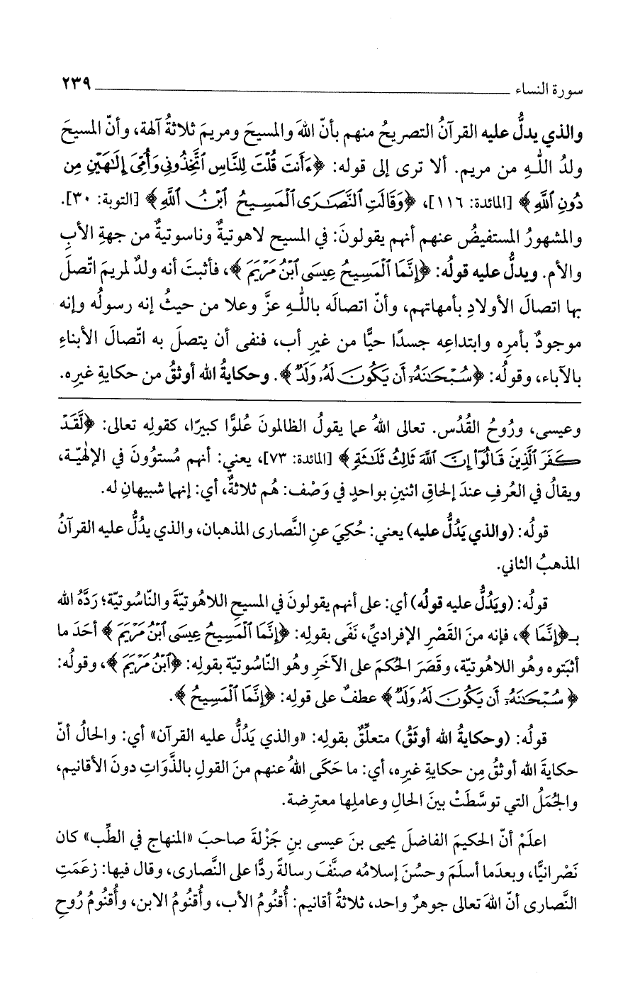 والذي يدل عليه القرآن التصريح منهم بأن اللَّه والمسيح ومريم ثلاثة آلهة، وأنّ المسيح ولد اللَّه من مريم. ألا ترى إلى قوله: (أَأَنْتَ قُلْتَ لِلنَّاسِ اتَّخِذُونِي وَأُمِّي إِلهَيْنِ مِنْ دُونِ اللَّهِ) [المائدة: 116]، (وَقالَتِ النَّصارى الْمَسِيحُ ابْنُ اللَّهِ) [التوبة: 30]. والمشهور المستفيض عنهم أنهم يقولون: في المسيح لاهوتية وناسوتية من جهة الأب والأم. ويدل عليه قوله: (إِنَّمَا الْمَسِيحُ عِيسَى ابْنُ مَرْيَمَ)، فأثبت أنه ولد لمريم اتصل بها اتصال الأولاد بأمّهاتها، وأن اتصاله باللَّه عز وعلا من حيث أنه رسوله وإنه موجود بأمره وابتداعه جسداً حياً من غير أب، فنفى أن يتصل به اتصال الأبناء بالآباء، وقوله: (سُبْحانَهُ أَنْ يَكُونَ لَهُ وَلَدٌ). وحكاية اللَّه أوثق من حكاية غيره.