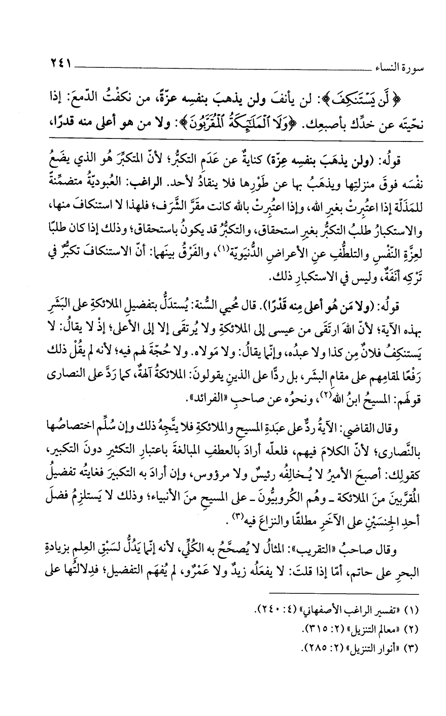 (لَن يَسْتَنْكِفَ): لن يأنف ولن يذهب بنفسه عزة من نكفت الدمع. إذا نحيته عن خدك بإصبعك (ولَا الْمَلائِكَةُ الْمُقَرَّبُونَ): ولا من هو أعلى منه قدراً،