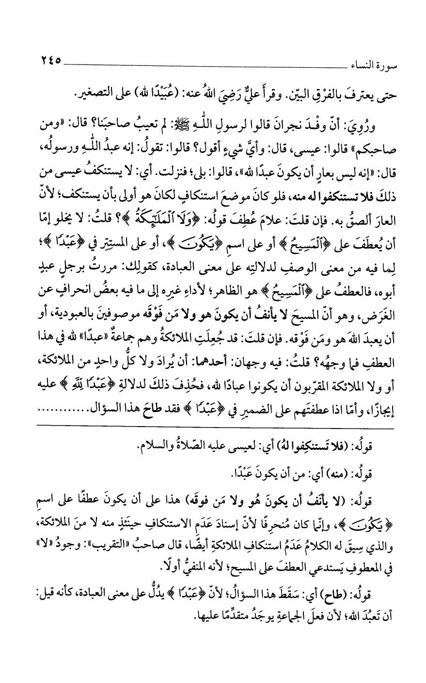 وروي: أن وفد نجران قالوا لرسول اللَّه صلى اللَّه عليه وسلم: لم تعيب صاحبنا؟ قال: "ومن صاحبكم" قالوا: عيسى، قال: وأى شيء أقول؟ قالوا: تقول: إنه عبد اللَّه ورسوله، قال: "إنه ليس بعارٍ أن يكون عبداً للَّه". قالوا: بلى، فنزلت: أي: لا يستنكف عيسى من ذلك فلا تستنكفوا له منه، فلو كان موضع استنكافٍ لكان هو أولى بأن يستنكف؛ لأنّ العار ألصق به. فإن قلت: علام عطف قوله: (ولَا الْمَلائِكَةُ)؟ قلت: لا يخلو إمّا أن يعطف على (المسيح) أو على اسم (يكون)، أو على المستتر في (عَبْداً)؛ لما فيه من معنى الوصف لدلالته على معنى العبادة، كقولك: مررت برجلٍ عبدٍ أبوه، فالعطف على (المسيح) هو الظاهر لأداء غيره إلى ما فيه بعض انحرافٍ عن الغرض، وهو أن المسيح لا يأنف أن يكون هو ولا من فوقه موصوفين بالعبودية، أو أن يعبد اللَّه هو ومن فوقه. فإن قلت: قد جعلت الملائكة وهم جماعة "عبداً" للَّه في هذا العطف، فما وجهه؟ قلت: فيها وجهان: أحدهما: أن يراد ولا كل واحدٍ من الملائكة، أو ولا الملائكة المقرّبون أن يكونوا عباداً للَّه، فحذف ذلك لدلالة (عبد الله) عليه إيجازاً، وأمّا إذا عطفتهم على الضمير في (عَبْداً) فقد طاح هذا السؤال ......