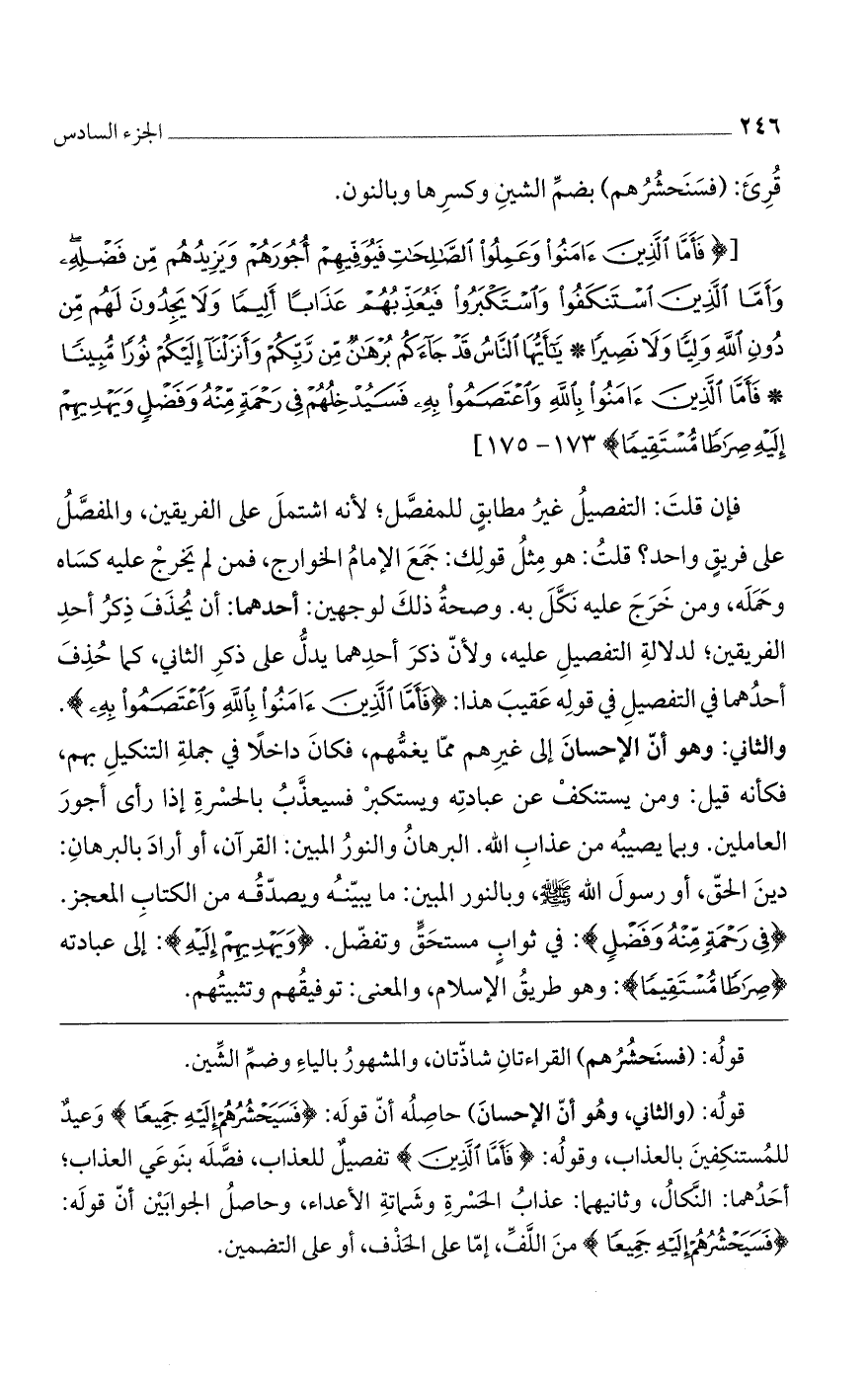 قوله: (والثاني، وهو أن الإحسان) حاصله أن قوله: {فَسَيَحْشُرُهُمْ إِلَيْهِ جَمِيعاً} وعيد للمستنكفين بالعذاب، وقوله: {فَأَمَّا الَّذِينَ} تفصيلٌ للعذاب، فصله بنوعي العذاب؛ أحدهما: النكال، وثانيهما: عذاب الحسرة وشماتة الأعداء، وحاصل الجوابين أن قوله: {فَسَيَحْشُرُهُمْ إِلَيْهِ جَمِيعاً} من اللف، إما على الحذف، أو على التضمين.