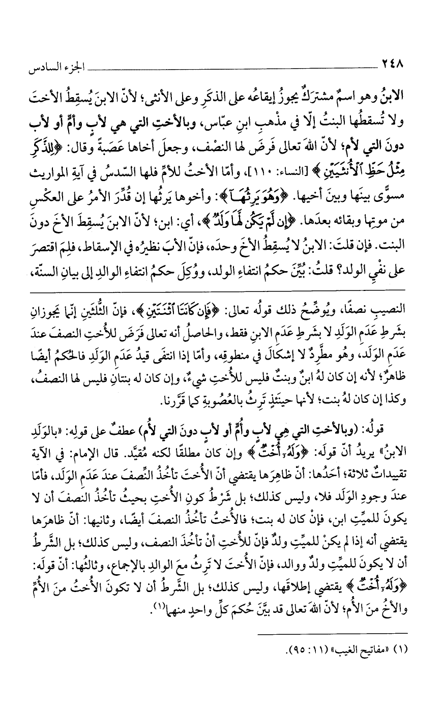 قوله: (وبالأخت التي هي لأب وأم أو لأب دون التي لأم) عطف على قوله: "بالولد الابن" يريد أن قوله: {وَلَهُ أُخْتٌ} وإن كان مطلقاً لكنه مقيد. قال الإمام: في الآية تقييدات ثلاثة؛ أحدها: أن ظاهرها يقتضي أن الأخت تأخذ النصف عند عدم الولد، فأما عند وجود الولد فلا، وليس كذلك؛ بل شرط كون الأخت بحيث تأخذ النصف أن لا يكون للميت ابن، فإن كان له بنت؛ فالأخت تأخذ النصف أيضاً، وثانيها: أن ظاهرها يقتضي أنه إذا لم يكن للميت ولدٌ ووالد، فإن الأخت لا ترث مع الوالد بالإجماع، وثالثها: أن قوله: {وَلَهُ أُخْتٌ} يقتضي إطلاقها، وليس كذلك؛ بل الشرط أن لا تكون الأخت من الأم والأخ من الأم؛ لأن الله تعالى قد بين حكم كل واحد منهما.