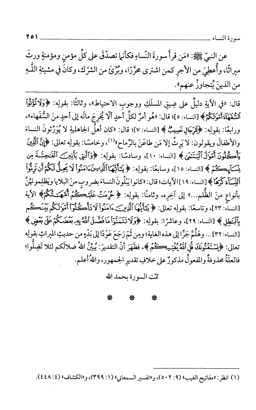 قال: "في الآية دليل على ضيق المسلك ووجوب الاحتياط"، وثالثاً: بقوله: {وَلا تُؤْتُوا السُّفَهَاءَ أَمْوَالَكُمْ} [النساء: 5]؛ قال: "هو أمرٌ لكل أحد ألا يخرج ماله إلى أحد من السفهاء"، ورابعاً: بقوله: {لِلرِّجَالِ نَصِيبٌ} [النساء: 7]؛ قال: "كان أهل الجاهلية لا يورثون النساء والأطفال ويقولون: لا يرث إلا من طاعن بالرماح"، وخامساً: بقوله تعالى: {إِنَّ الَّذِينَ يَاكُلُونَ أَمْوَالَ الْيَتَامَى} [النساء: 10]، وسادساً: بقوله: {وَاللاَّتِي يَاتِينَ الْفَاحِشَةَ مِنْ نِسَائِكُمْ} [النساء: 19] الآيات؛ قال: "كانوا يبلون النساء بضروب من البلايا ويظلمونهن بأنواع من الظلم ... " إلى آخره، وثامناً: بقوله: {حُرِّمَتْ عَلَيْكُمْ أُمَّهَاتُكُمْ} [النساء: 39]، وعاشراً: بقوله: {يَا أَيُّهَا الَّذِينَ آمَنُوا لا تَاكُلُوا أَمْوَالَكُمْ بَيْنَكُمْ بِالْبَاطِلِ} [النساء: 29]، وعاشراً: بقوله: {وَلا تَتَمَنَّوْا مَا فَضَّلَ اللَّهُ بِهِ بَعْضَكُمْ عَلَى بَعْضٍ} [النساء: 32] ... وهلم جرا إلى هذه الغاية؛ ومن ثم رجع عوداً إلى بدء من حديث الميراث بقوله تعالى: {يَسْتَفْتُونَكَ قُلْ اللَّهُ يُفْتِيكُمْ}، فظهر أن التقدير: يبين الله ضلالكم لئلا تضلوا؛ فالعلة محذوفة والمفعول مذكور على خلاف تقدير الجمهور، والله أعلم.