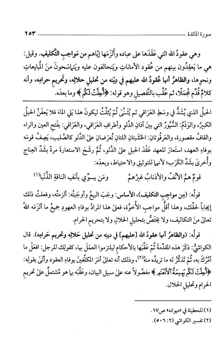 قوله: (والظاهر أنها عقود الله [عليهم] في دينه من تحليل حلاله وتحريم حرامه). قال الكواشي: ذكر هذه المقدمة ثم عقبها بالأحكام ليلتزموا العمل بها، كقولك للرجل: افعل ما آمرك به، ثم تذكر له ما تريده منه، وذلك أنه تعالى أمر المكلفين بوفاء العقود وأتى بقوله: {أُحِلَّتْ لَكُمْ بَهِيمَةُ الأَنْعَامِ} مفصولاً عنه على سبيل البيان، وعقبه بما هو مشتمل على تحريم الحرام وتحليل الحلال.