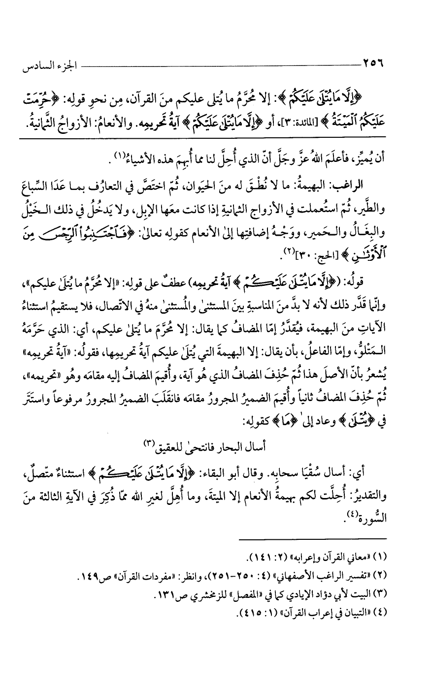 قوله: ({إِلاَّ مَا يُتْلَى عَلَيْكُمْ} آية تحريمه) عطفٌ على قوله: "إلا محرم ما يتلى عليكم"، وإنما قدر ذلك لأنه لابد من المناسبة بين المستثنى والمستثنى منه في الاتصال، فلا يستقيم استثناء الآيات من البهيمة، فيقدر إما المضاف كما يقال: إلا محرم ما يتلى عليكم، أي: الذي حرمه المتلو، وإما الفاعل، بأن يقال: إلا البهيمة التي يتلى عليكم آية تحريمها، فقوله: "آية تحريمه" يشعر بأن الأصل هذا ثم حُذف المضاف الذي هو آية، وأقيم المضاف إليه مقامه وهو "تحريمه"، ثم حذف المضاف ثانياً وأقيم الضمير المجرور مقامه فانقلب الضمير المجرور مرفوعاً واستتر في {يُتْلَى} وعاد إلى {ما} كقوله: