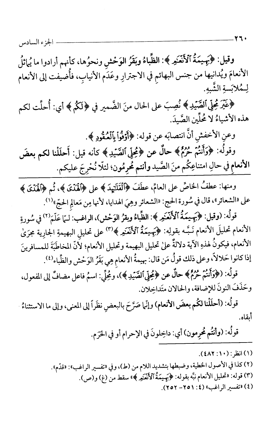 قوله: (وقيل: {بَهِيمَةِ الأَنْعَامِ}: الظباء وبقر الوحش)، الراغب: لما علم في سورة الأنعام تحليل الأنعام نبه بقوله: {بَهِيمَةِ الأَنْعَامِ} على تحليل البهيمة الجارية مجرى الأنعام، فيكون لهذه الآية دلالة على تحليل البهيمة وتحليل الأنعام؛ لأن المخاطبة للمسافرين إذا كانوا حلالاً، وعلى ذلك قول من قال: بهيمة الأنعام هي بقر الوحش والظباء.