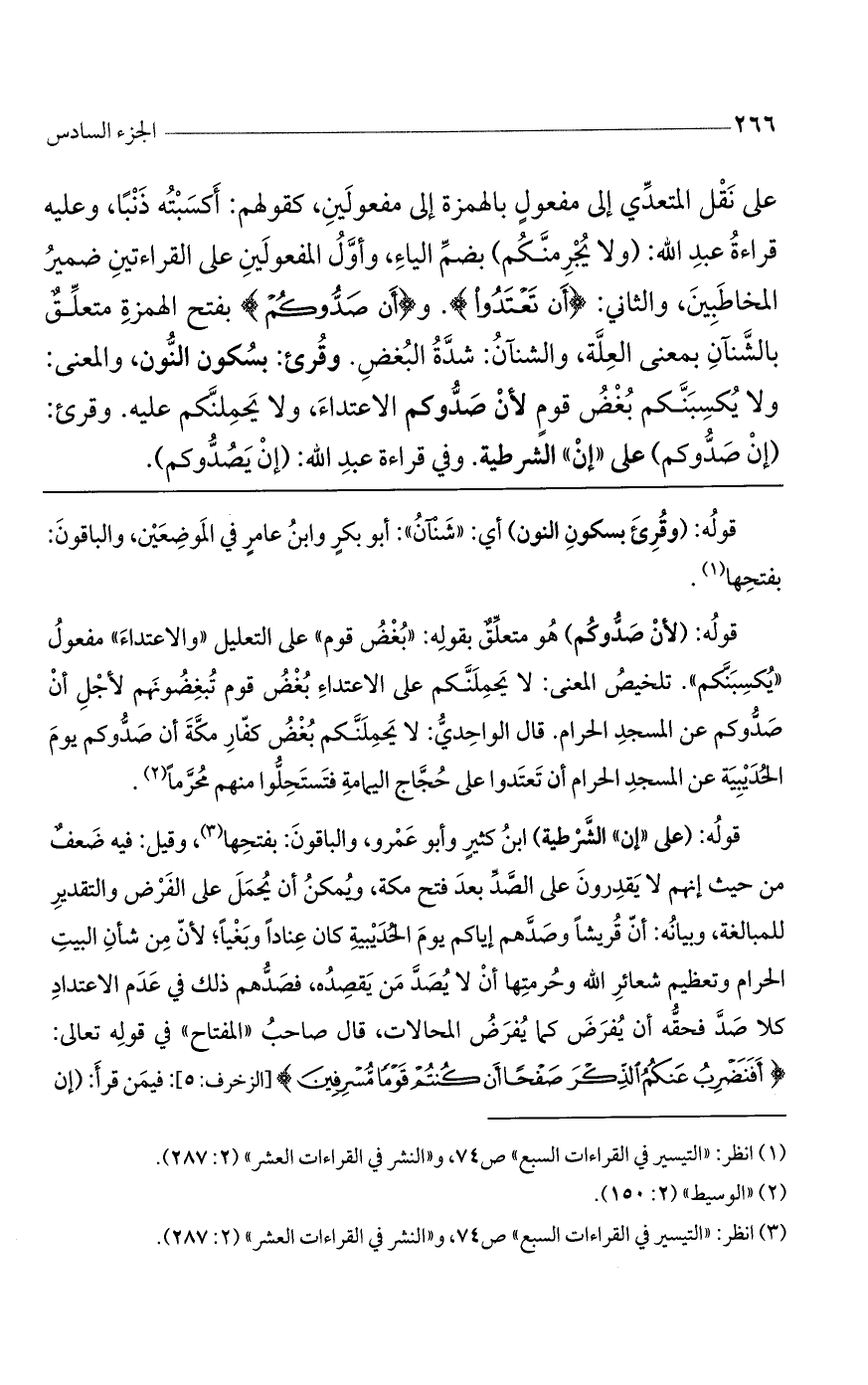 على نقل المتعدي إلى مفعول بالهمزة إلى مفعولين، كقولهم: أكسبته ذنباً. وعليه قراءة عبد اللَّه: (ولا يجرمنكم) بضم الياء، وأوّل المفعولين على القراءتين ضمير المخاطبين، والثاني: (أَنْ تَعْتَدُوا). و (أَنْ صَدُّوكُمْ) بفتح الهمزة متعلق بالشنآن بمعنى العلة، والشنآن: شدّة البغض. وقرئ: بسكون النون، والمعنى: ولا يكسبنكم بغض قومٍ لأن صدّوكم الاعتداء، ولا يحملنكم عليه. وقرئ: (إن صدوكم) على «إن» الشرطية. وفي قراءة عبد اللَّه: (إن يصدوكم).