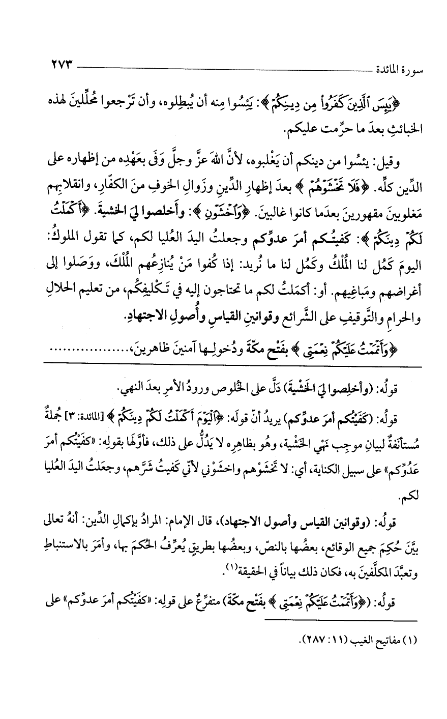 وقيل: يئسوا من دينكم أن يغلبوه، لأن اللَّه عز وجل وفى بوعده من إظهاره على الدين كله. (فَلا تَخْشَوْهُمْ) بعد إظهار الدين وزوال الخوف من الكفار، وانقلابهم مغلوبين مقهورين بعد ما كانوا غالبين (وَاخْشَوْنِي): وأخلصوا لي الخشية. (أَكْمَلْتُ لَكُمْ دِينَكُمْ): كفيتكم أمر عدوّكم وجعلت اليد العليا لكم، كما تقول الملوك: اليوم كمل لنا الملك وكمل لنا ما نريد: إذا كفوا من ينازعهم الملك، ووصلوا إلى أغراضهم ومباغيهم. أو: أكملت لكم ما تحتاجون إليه في تكليفكم من تعليم الحلال والحرام والتوقيف على الشرائع وقوانين القياس وأصول الاجتهاد.