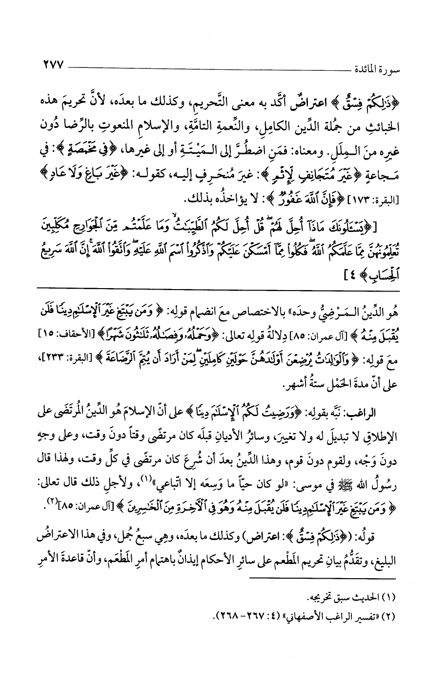 الراغب: نبه بقوله: {وَرَضِيتُ لَكُمْ الإِسْلامَ دِيناً} على أن الإسلام هو الدين المرتضى على الإطلاق لا تبديل له ولا تغيير، وسائر الأديان قبله كان مرتضى وقتاً دون وقت، وعلى وجه دون وجه، ولقوم دون قوم، وهذا الدين بعد أن شُرع كان مرتضى في كل وقت، ولهذا قال رسول الله صلى الله عليه وسلم في موسى: "لو كان حياً ما وسعه إلا اتباعي"، ولأجل ذلك قال تعالى: {وَمَنْ يَبْتَغِ غَيْرَ الإِسْلامِ دِيناً فَلَنْ يُقْبَلَ مِنْهُ وَهُوَ فِي الآخِرَةِ مِنْ الْخَاسِرِينَ} [آل عمران: 85].