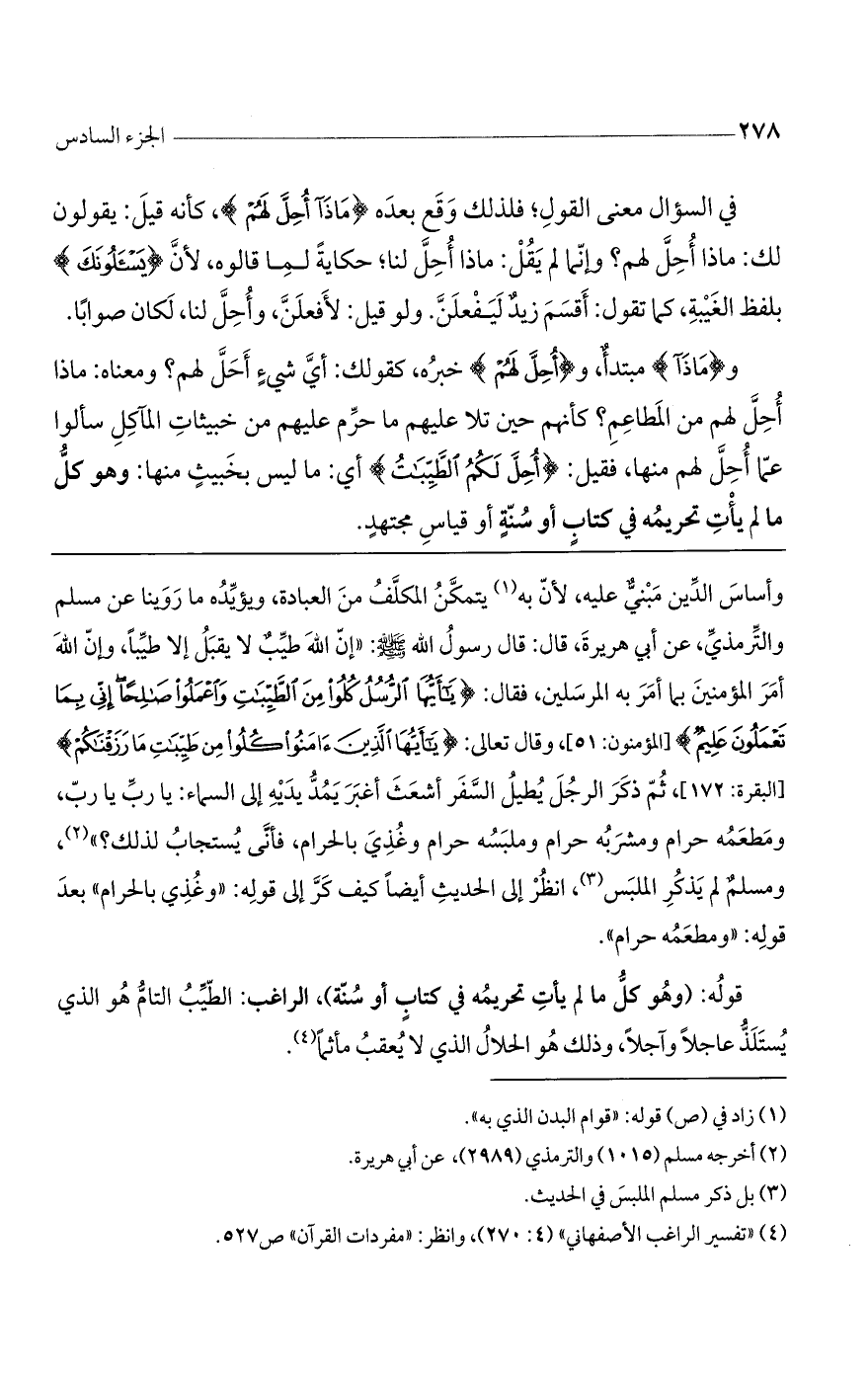 وأساس الدين مبني عليه، لأن به يتمكن المكلف من العبادة، ويؤيده ما روينا عن مسلم والترمذي، عن أبي هريرة، قال: قال رسول الله صلى الله عليه وسلم: "إن الله طيب لا يقبل إلا طيبا، وإن الله أمر المؤمنين بما أمر به المرسلين، فقال: {يَا أَيُّهَا الرُّسُلُ كُلُوا مِنْ الطَّيِّبَاتِ وَاعْمَلُوا صَالِحاً إِنِّي بِمَا تَعْمَلُونَ عَلِيمٌ} [المؤمنون: 51]، وقال تعالى: {يَا أَيُّهَا الَّذِينَ آمَنُوا كُلُوا مِنْ طَيِّبَاتِ مَا رَزَقْنَاكُمْ} [البقرة: 172]، ثُم ذكر الرجل يُطيل السفر أشعث أغبر يمد يديه إلى السماء: يا رب يا رب، ومطعمه حرام ومشربه حرام وملبسه حرام وغُذي بالحرام، فأنى يُستجاب لذلك؟ "، ومسلم لم يذكر الملبس، انظر إلى الحديث أيضاً كيف كر إلى قوله: "وغُذي بالحرام" بعد قوله: "ومطعمه حرام".