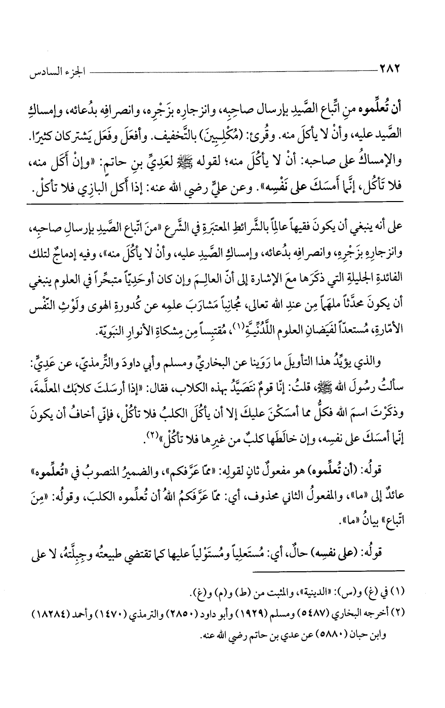 على أنه ينبغي أن يكون فقيهاً عالماً بالشرائط المعتبرة في الشرع "من اتباع الصيد بإرسال صاحبه، وانزجاره بزجره، وانصرافه بدعائه، وإمساك الصيد عليه، وأن لا يأكل منه"، وفيه إدماج لتلك الفائدة الجليلة التي ذكرها مع الإشارة إلى أن العالم وإن كان أوحدياً متبحراً في العلوم ينبغي أن يكون محدثاً ملهماً من عند الله تعالى، مجانباً مشارب علمه عن كدوره الهوى ولوث النفس الأمارة، مستعداً لفيضان العلوم اللدنية، مقتبساً من مشكاة الأنوار النبوية.