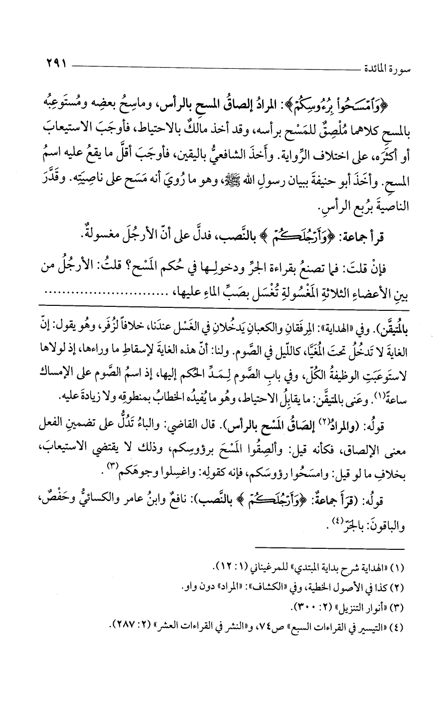 (وَامْسَحُوا بِرُؤُسِكُمْ): المراد إلصاق المسح بالرأس، وماسح بعضه ومستوعبه بالمسح كلاهما ملصق للمسح برأسه، فقد أخذ مالكٌ بالاحتياط فأوجب الاستيعاب أو أكثره على اختلاف الرواية. وأخذ الشافعي باليقين، فأوجب أقل ما يقع عليه اسم المسح وأخذ أبو حنيفة ببيان رسول اللَّه صلى اللَّه عليه وسلم وهو ما روى: أنه مسح على ناصيته. وقدر الناصية بربع الرأس.