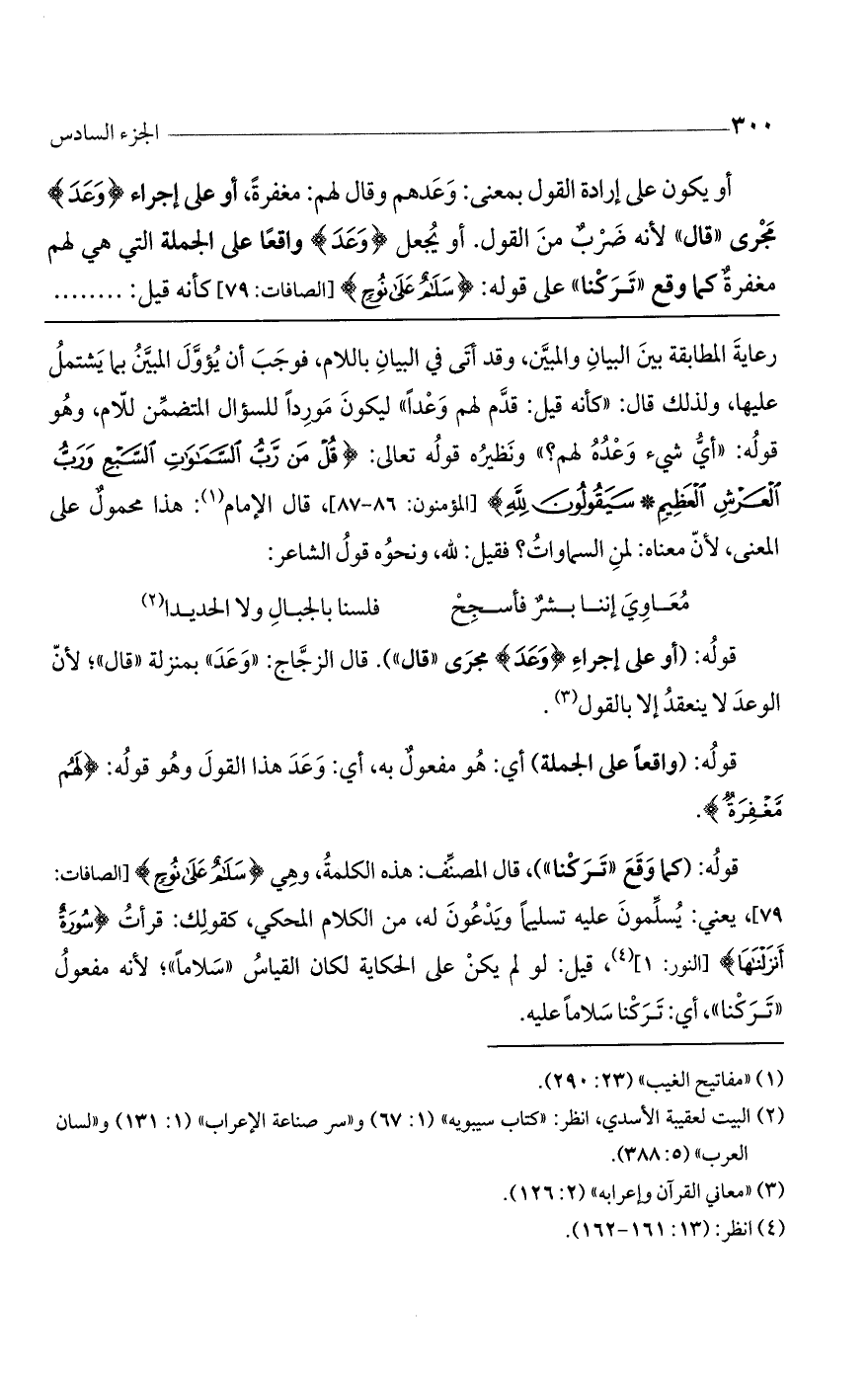 أو يكون على إرادة القول بمعنى وعدهم وقال لهم مغفرة. أو على إجراء (وعد) مجرى "قال" لأنه ضرب من القول. أو يجعل (وعد) واقعاً على الجملة التي هي لهم مغفرة، كما وقع (تركنا) على قوله: (سَلامٌ عَلى نُوحٍ) [الصافات: 79] كأنه قيل: ........