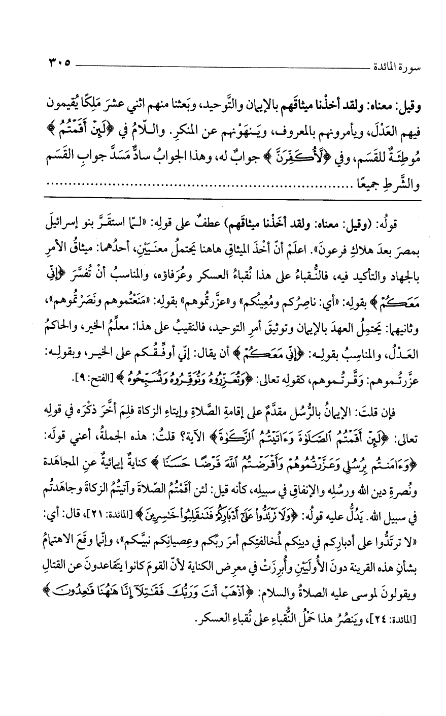 فإن قلت: الإيمان بالرسل مقدم على إقامة الصلاة وإيتاء الزكاة فلم أخر ذكره في قوله تعالى: {لَئِنْ أَقَمْتُمْ الصَّلاةَ وَآتَيْتُمْ الزَّكَاةَ} الآية؟ قلت: هذه الجملة، اعني قوله: {وَآمَنْتُمْ بِرُسُلِي وَعَزَّرْتُمُوهُمْ وَأَقْرَضْتُمْ اللَّهَ قَرْضاً حَسَناً} كناية إيمائية عن المجاهدة ونصرة دين الله ورسله والإنفاق في سبيله، كأنه قيل: لئن أقمتم الصلاة وآتيتم الزكاة وجاهدتم في سبيل الله. يدل عليه قوله: {وَلا تَرْتَدُّوا عَلَى أَدْبَارِكُمْ فَتَنْقَلِبُوا خَاسِرِينَ} [المائدة: 21]، قال: أي: "لا ترتدوا على أدباركم في دينكم لمخالفتكم أمر ربكم وعصيانكم نبيكم"، وإنما وقع الاهتمام بشأن هذه القرينة دون الأوليين وأبرزت في معرض الكناية لأن القوم كانوا يتقاعدون عن القتال ويقولون لموسى عليه الصلاة والسلام: {اذْهَبْ أَنْتَ وَرَبُّكَ فَقَاتِلا إِنَّا هَاهُنَا قَاعِدُونَ} [المائدة: 24]، وينصر هذا حمل النقباء على نُقباء العسكر.