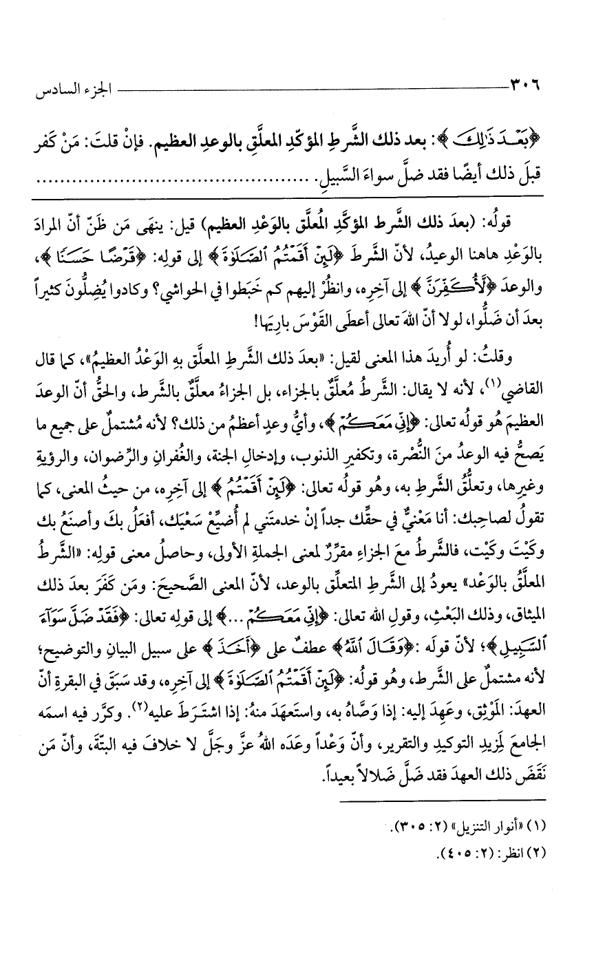 وقلت: لو أريد هذا المعنى لقيل: "بعد ذلك الشرط المعلق به الوعد العظيم"، كما قال القاضي، لأنه لا يقال: الشرط معلق بالجزاء معلق بالشرط، والحق أن الوعد العظيم هو قوله تعالى: {إِنِّي مَعَكُمْ}، وأي وعد أعظم من ذلك؟ لأنه مشتمل على جميع ما يصح فيه الوعد من النصرة، وتكفير الذنوب، وإدخال الجنة، والغفران والرضوان، والرؤية وغيرها، وتعلق الشرط به، وهو قوله تعالى: {لَئِنْ أَقَمْتُمْ} إلى آخره، من حيث المعنى، كما تقول لصاحبك: أنا معنى في حقك جداً إن خدمتني لم أضيع سعيك، أفعل بك وأصنع بك وكيت وكيت، فالشرط مع الجزاء مقرر لمعنى الجملة الأولى، وحاصل معنى قوله: "الشرط المعلق بالوعد" يعود إلى الشرط المتعلق بالوعد، لأن المعنى الصحيح: ومن كفر بعد ذلك الميثاق، وذلك البعث، وقول الله تعالى: {إِنِّي مَعَكُمْ} إلى قوله تعالى: {فَقَدْ ضَلَّ سَوَاءَ السَّبِيلِ}؛ لأن قوله: {وَقَالَ اللَّهُ} عطف على {أَخَذْ} على سبيل البيان والتوضيح؛ لأنه مشتمل على الشرط، وهو قوله: {لَئِنْ أَقَمْتُمْ الصَّلاةَ} إلى آخره، وقد سبق في البقرة أن العهد: الموثق، وعهد إليه: إذا وصاه به، واستعهد منه: إذا اشترط عليه. وكرر فيه اسمه الجامع لمزيد التوكيد والتقرير، وأن وعداً وعده الله عز وجل لا خلاف فيه البتة، وأن من نقض ذلك العهد فقد ضل ضلالاً بعيداً.