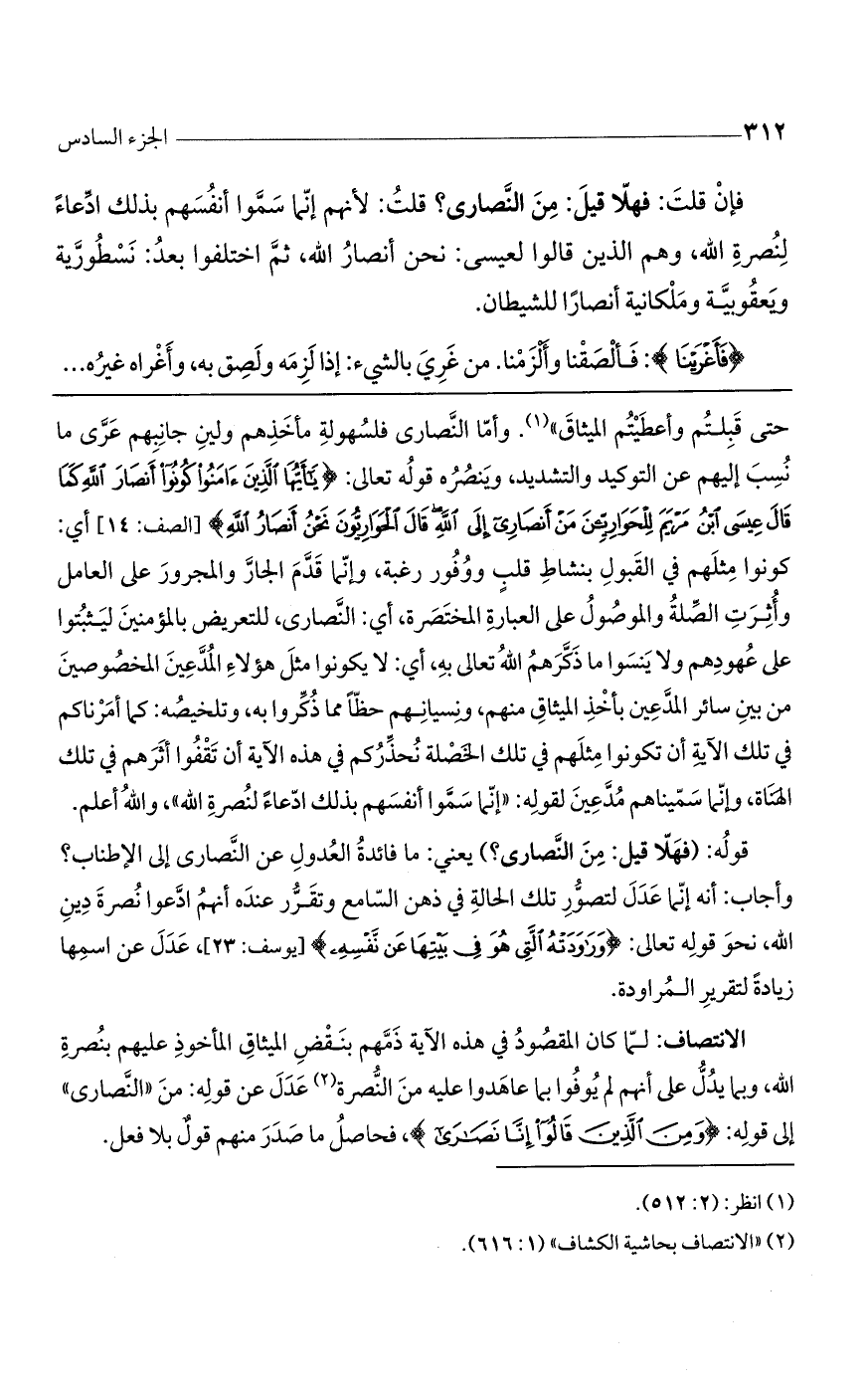 فإن قلت: فهلا قيل: من النصارى؟ قلت: لأنهم إنما سموا أنفسهم بذلك ادعاءً لنصرة اللَّه، وهم الذين قالوا لعيسى: نحن أنصار اللَّه، ثم اختلفوا بعد: نسطورية، ويعقوبية، وملكانية. أنصارا للشيطان.