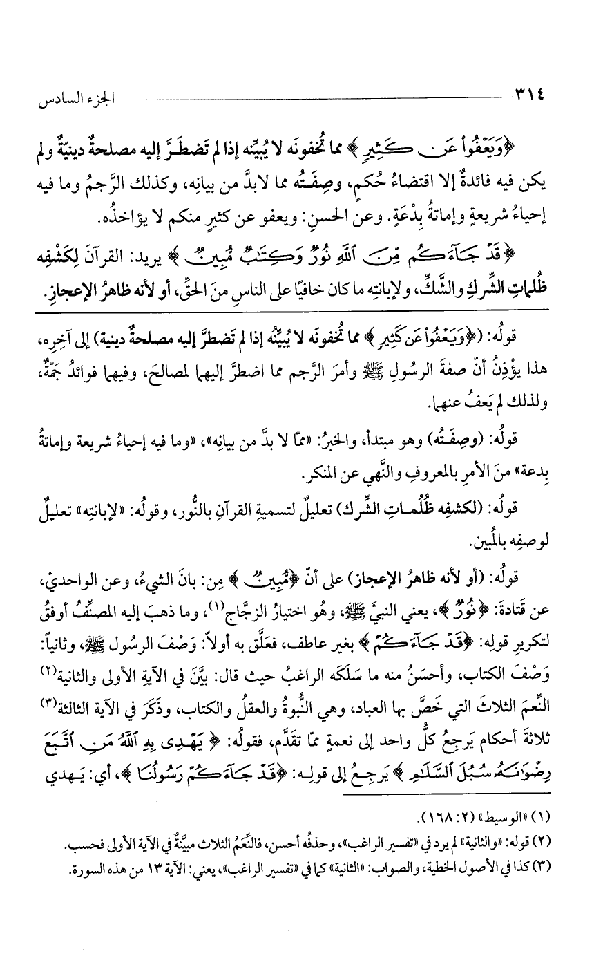(قَدْ جاءَكُمْ مِنَ اللَّهِ نُورٌ وَكِتابٌ مُبِينٌ) يريد: القرآن لكشفه ظلمات الشرك والشك، ولإبانته ما كان خافياً عن الناس من الحق. أو لأنه ظاهر الإعجاز.