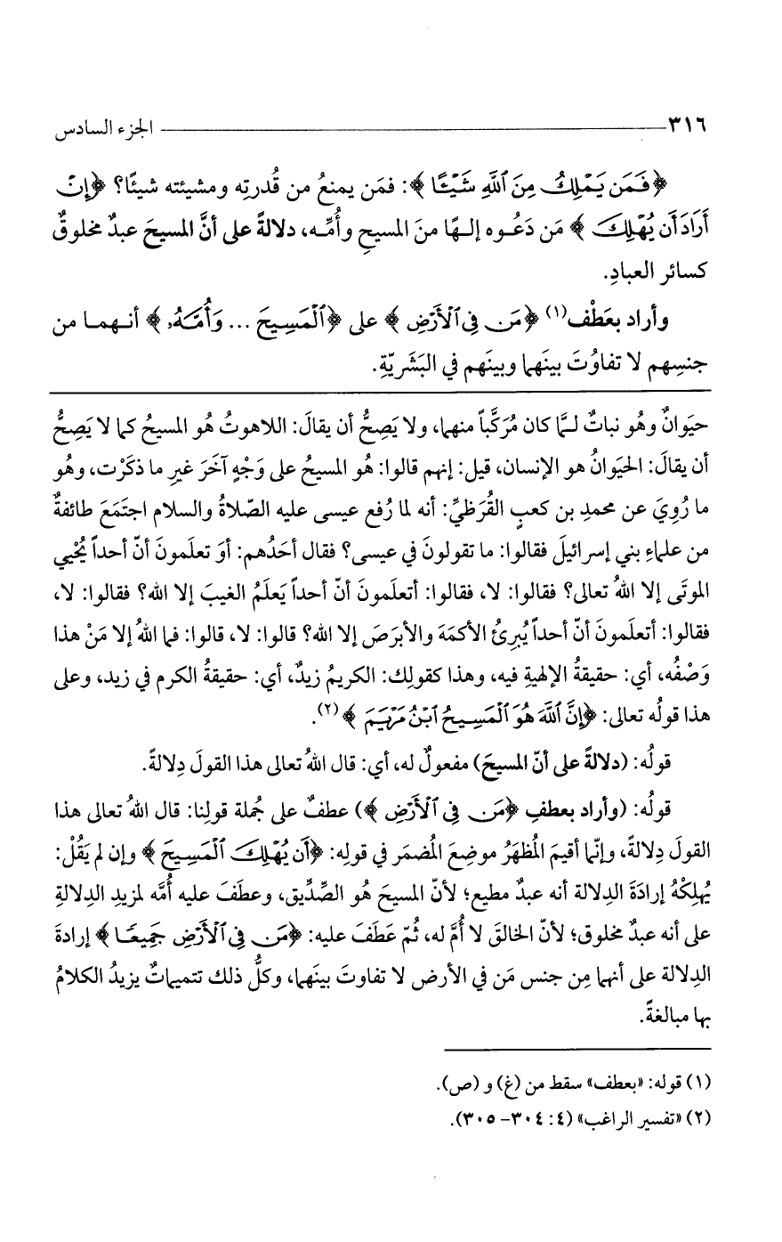 قوله: (وأراد بعطف {مَنْ فِي الأَرْضِ}) عطف على جملة قولنا: قال الله تعالى هذا القول دلالة، وإنما أقيم المظهر موضع المضمر في قوله: {أَنْ يُهْلِكَ الْمَسِيحَ} وإن لم يقل: يهلكه إرادة الدلالة أنه عبدٌ مطيع؛ لأن المسيح هو الصديق، وعطف عليه أمه لمزيد الدلالة على أنه عبد مخلوق؛ لأن الخالق لا أم له، ثم عطف عليه: {مَنْ فِي الأَرْضِ جَمِيعاً} إرادة الدلالة على أنهما من جنس من في الأرض لا تفاوت بينهما، وكل ذلك تتميمات يزيد الكلام بها مبالغة.