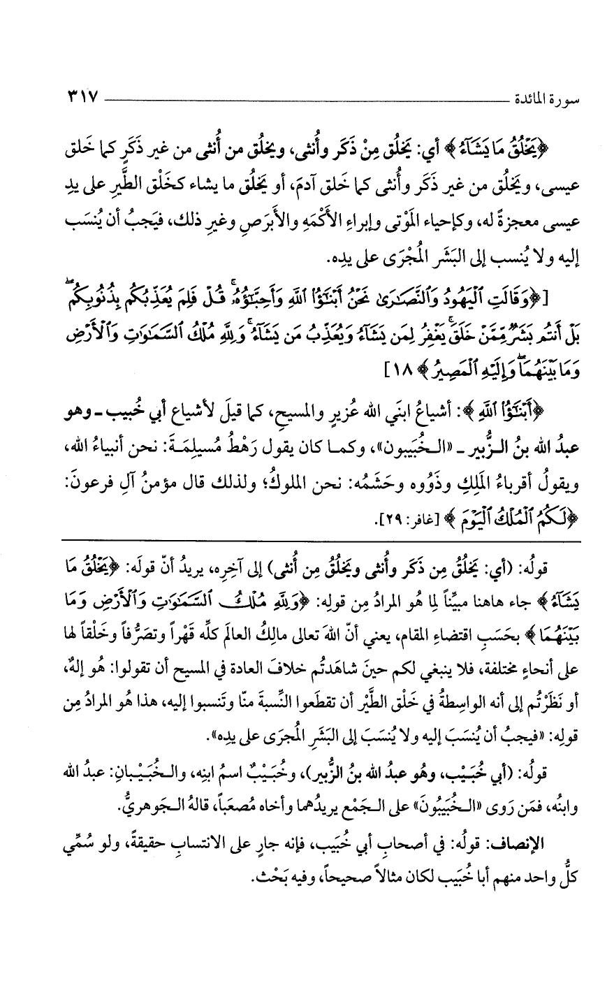 قوله: (أي: يخلق من ذكر وأنثى ويخلق من أنثى) إلى آخره، يريد أن قوله: {يَخْلُقُ مَا يَشَاءُ} جاء هاهنا مبيناً لما هو المراد من قوله: {وَلِلَّهِ مُلْكُ السَّمَوَاتِ وَالأَرْضِ وَمَا بَيْنَهُمَا} بحسب اقتضاء المقام، يعني أن الله تعالى مالك العالم كله قهراً وتصرفاً وخلقاً لها على أنحاء مختلفة، فلا ينبغي لكم حين شاهدتم خلاف العادة في المسيح أن تقولوا: هو إله، أو نظرتم إلى أنه الواسطة في خلق الطير أن تقطعوا النسبة منا وتنسبوا إليه، هذا هو المراد من قوله: "فيجب أن ينسب إليه ولا ينسب إلى البشر المُجرى على يده".