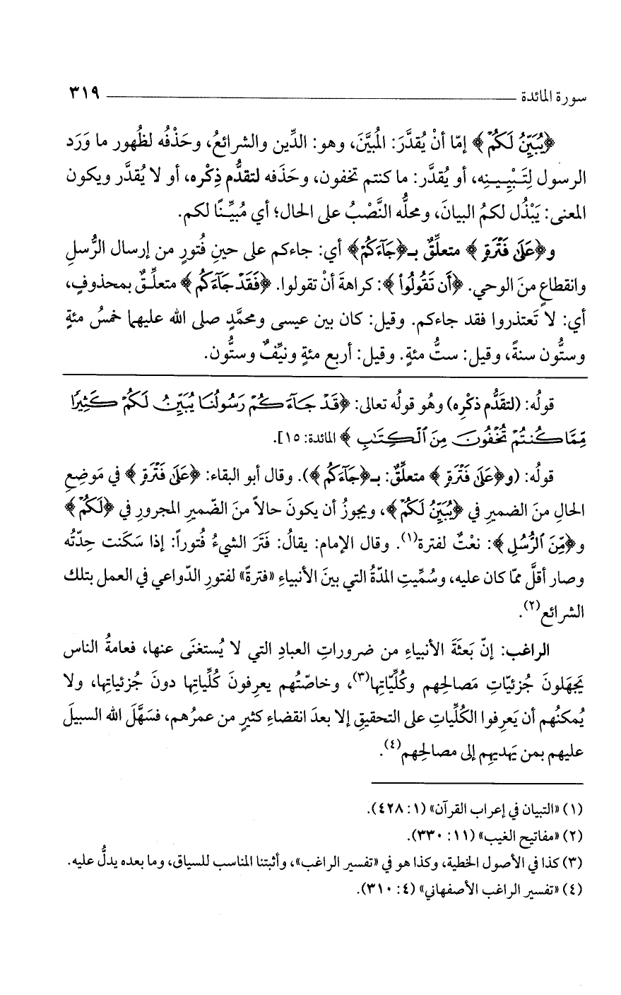 قوله: ({عَلَى فَتْرَةٍ} متعلق: بـ {جَاءَكُمْ}). وقال أبو البقاء: {عَلَى فَتْرَةٍ} في موضع الحال من الضمير في {يُبَيِّنَ لَكُمْ}، ويجوز أن يكون حالاً من الضمير المجرور في {لَكُمْ} و {مِنْ الرُّسُلِ}: نعت لفترة. وقال الإمام: يقال: فتر الشيء فتوراً: إذا سكنت حدته وصار أقل مما كان عليه، وسميت المدة التي بين الأنبياء "فترة" لفتور الدواعي في العمل بتلك الشرائع.