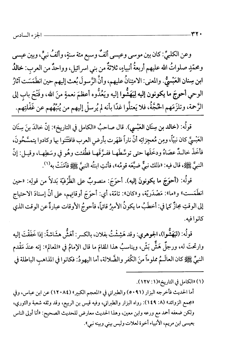 قوله: (خالد بن سنان العبسي). قال صاحب "الكامل في التاريخ": إن خالد بن سنان العبسي كان نبياً، ومن معجزاته أن ناراً ظهرت بأرض العرب فافتتنوا بها وكادوا يتمسحون، فأخذ خالد عصاه ودخلها حتى توسطها ففرقها فطفئت وهو في وسطها، وقيل: إن النبي صلى الله عليه وسلم، قال فيه: "ذلك نبي ضيعه قومه"، فأتت ابنته النبي صلى الله عليه وسلم فآمنت به.