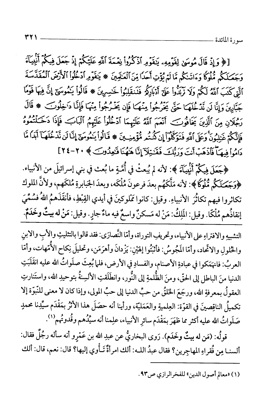 (جَعَلَ فِيكُمْ أَنْبِياءَ): لأنه لم يبعث في أمّة ما بعث في بنى إسرائيل من الأنبياء (وَجَعَلَكُمْ مُلُوكاً لأنه ملكهم بعد فرعون ملكه، وبعد الجبابرة ملكهم ولأنّ الملوك تكاثروا فيهم تكاثر الأنبياء. وقيل: كانوا مملوكين في أيدى القبط فأنقذهم اللَّه، فسمى إنقاذهم ملكاً. وقيل: الملك: من له مسكنٌ واسعٌ فيه ماءٌ جارٍ. وقيل: من له بيت وخدم.