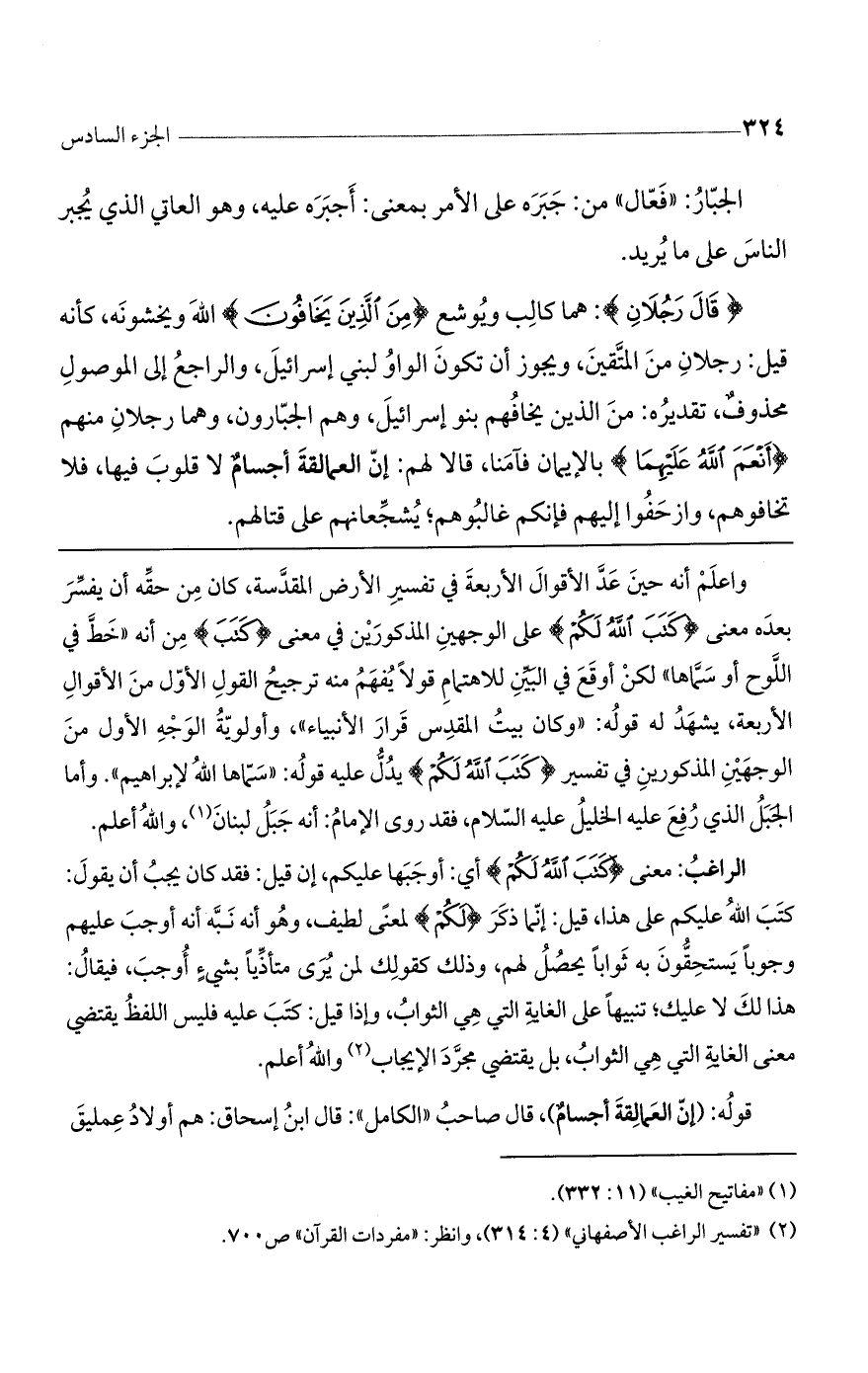 (قالَ رَجُلانِ): هما كالب ويوشع (مِنَ الَّذِينَ يَخافُونَ) الله ويخشونه، كأنه قيل: رجلان من المتقين، ويجوز أن تكون الواو لبني إسرائيل، والراجع إلى الموصول محذوف، تقديره: من الذين يخافهم بنو إسرائيل، وهم الجبارون، وهما رجلان منهم (أَنْعَمَ اللَّهُ عَلَيْهِمَا) بالإيمان فآمنا، قالا لهم: إن العمالقة أجسامٌ لا قلوب فيها، فلا تخافوهم وازحفوا إليهم فإنكم غالبوهم، يشجعانهم على قتالهم.