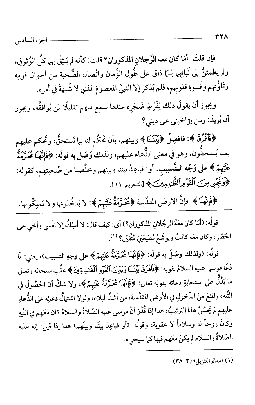 قوله: (أما كان معه الرجلان المذكوران؟ ) أي: كيف قال: لا أملك إلا نفسي وأخي على الحصر، وكان معه كالبٌ ويوشع مطيعين متقين؟