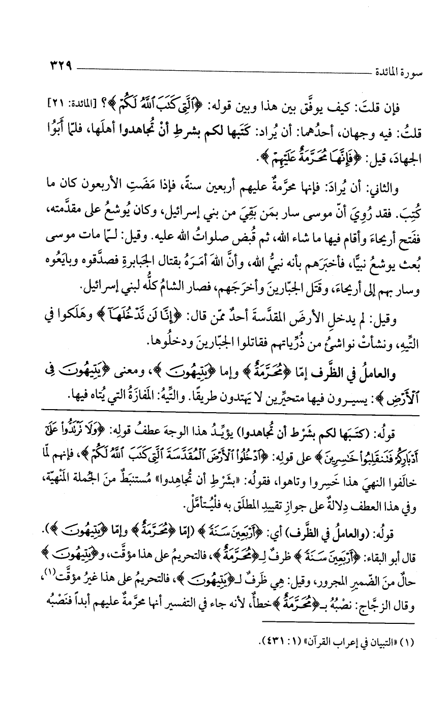 والثاني: أن يراد فإنها محرمةٌ عليهم أربعين سنةً، فإذا مضت الأربعون كان ما كتب. فقد روي أن موسى سار بمن بقي من بني إسرائيل، وكان يوشع على مقدمته، ففتح أريحاء وأقام فيها ما شاء اللَّه، ثم قبض صلوات اللَّه عليه. وقيل: لما مات موسى بعث يوشع نبياً، فأخبرهم بأنه نبيّ اللَّه، وأن اللَّه أمره بقتال الجبابرة، فصدقوه وبايعوه وسار بهم إلى أريحاء، وقتل الجبارين وأخرجهم، وصار الشام كله لبني إسرائيل.