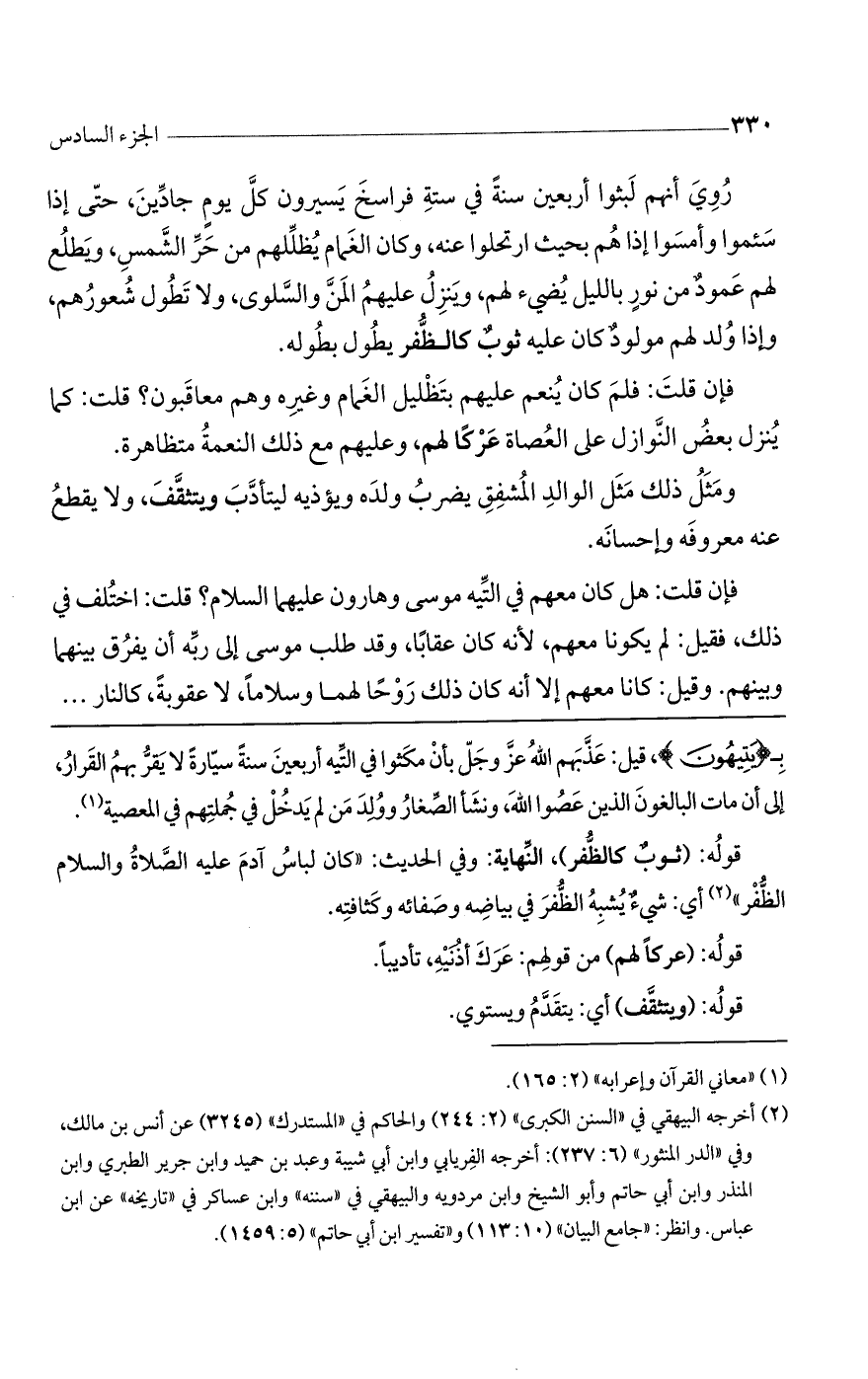 روي أنهم لبثوا أربعين سنة في ستةً فراسخ يسيرون كل يوم جادين، حتى إذا سئموا وأمسوا إذا هم بحيث ارتحلوا عنه، وكان الغمام يظللهم من حرّ الشمس، ويطلع لهم عمود من نورٍ بالليل يضيء لهم، وينزل عليهم المنّ والسلوى، ولا تطول شعورهم، وإذا ولد لهم مولود كان عليه ثوب كالظفر يطول بطوله.