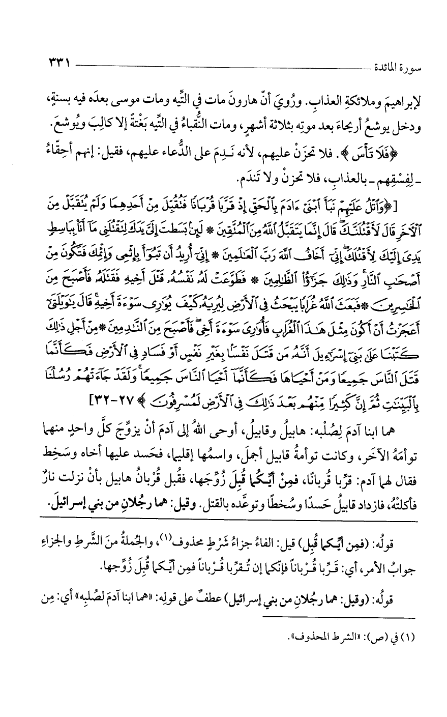 [(وَاتْلُ عَلَيْهِمْ نَبَأَ ابْنَيْ آدَمَ بِالْحَقِّ إِذْ قَرَّبا قُرْباناً فَتُقُبِّلَ مِنْ أَحَدِهِما وَلَمْ يُتَقَبَّلْ مِنَ الْآخَرِ قالَ لَأَقْتُلَنَّكَ قالَ إِنَّما يَتَقَبَّلُ اللَّهُ مِنَ الْمُتَّقِينَ* لَئِنْ بَسَطْتَ إِلَيَّ يَدَكَ لِتَقْتُلَنِي ما أَنَا بِباسِطٍ يَدِيَ إِلَيْكَ لِأَقْتُلَكَ إِنِّي أَخافُ اللَّهَ رَبَّ الْعالَمِينَ* إِنِّي أُرِيدُ أَنْ تَبُوءَ بِإِثْمِي وَإِثْمِكَ فَتَكُونَ مِنْ أَصْحابِ النَّارِ وَذلِكَ جَزاءُ الظَّالِمِينَ* فَطَوَّعَتْ لَهُ نَفْسُهُ قَتْلَ أَخِيهِ فَقَتَلَهُ فَأَصْبَحَ مِنَ الْخاسِرِينَ* فَبَعَثَ اللَّهُ غُراباً يَبْحَثُ فِي الْأَرْضِ لِيُرِيَهُ كَيْفَ يُوارِي سَوْأَةَ أَخِيهِ قالَ يا وَيْلَتى أَعَجَزْتُ أَنْ أَكُونَ مِثْلَ هذَا الْغُرابِ فَأُوارِيَ سَوْأَةَ أَخِي فَأَصْبَحَ مِنَ النَّادِمِينَ* مِنْ أَجْلِ ذلِكَ كَتَبْنا عَلى بَنِي إِسْرائِيلَ أَنَّهُ مَنْ قَتَلَ نَفْساً بِغَيْرِ نَفْسٍ أَوْ فَسادٍ فِي الْأَرْضِ فَكَأَنَّما قَتَلَ النَّاسَ جَمِيعاً وَمَنْ أَحْياها فَكَأَنَّما أَحْيَا النَّاسَ جَمِيعاً وَلَقَدْ جاءَتْهُمْ رُسُلُنا بِالْبَيِّناتِ ثُمَّ إِنَّ كَثِيراً مِنْهُمْ بَعْدَ ذلِكَ فِي الْأَرْضِ لَمُسْرِفُونَ)].