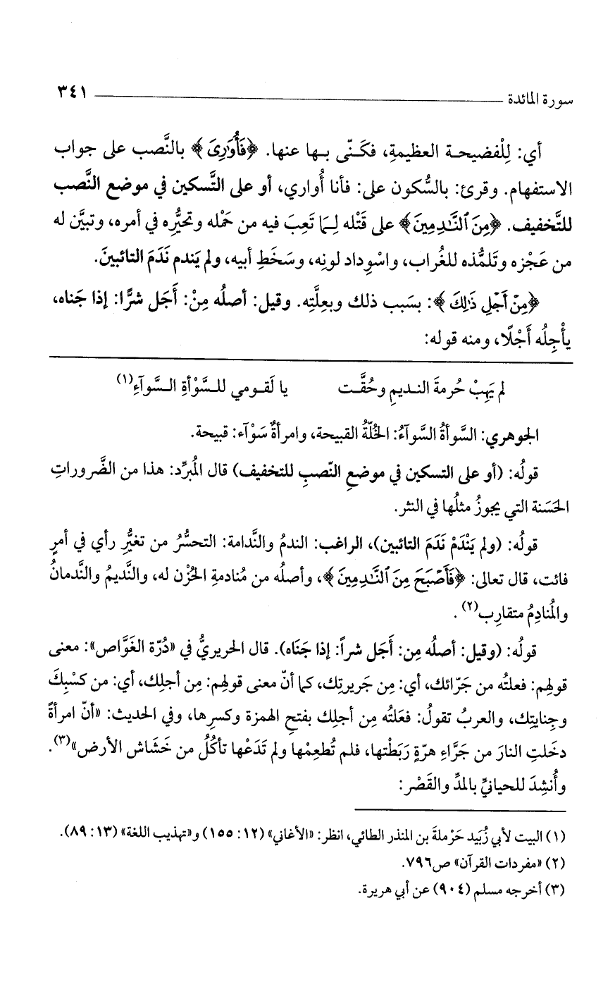 قوله: (وقيل: أصله من: أجل شراً: إذا جناه). قال الحريري في "درة الغواص": معنى قولهم: فعلته من جرائك، أي: من جريرتك، كما أن معنى قولهم: من أجلك، أي: من كسبك وجنايتك، والعرب تقول: فعلته من أجلك بفتح الهمزة وكسرها، وفي الحديث: "أن امرأة دخلت النار من جراء هرة ربطتها، فلم تطعمها ولم تدعها تأكل من خشاش الأرض". وأُنشد للحياني بالمد والقصر: