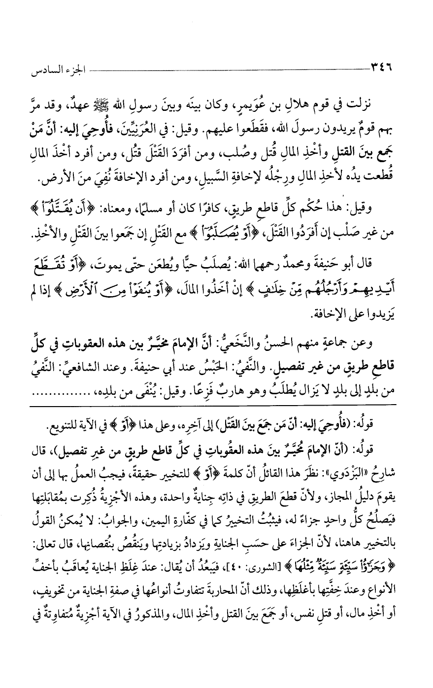 قوله: (أن الإمام مخير بين هذه العقوبات في كل قاطع طريق من غير تفصيل)، قال شارح "البزدوي": نظر هذا القائل أن كلمة {أَوْ} للتخيير حقيقة، فيجب العمل بها إلى أن يقوم دليل المجاز، ولأن قطع الطريق في ذاته جناية واحدة، وهذه الجزية ذُكرت بمقابلتها فيصلح كل واحد جزاء له، فيثبت التخيير كما في كفارة اليمين، والجواب: لا يمكن القول بالتخيير هاهنا، لأن الجزاء على حسب الجناية ويزداد بزيادتها وينقص بنقصانها، قال تعالى: {وَجَزَاءُ سَيِّئَةٍ سَيِّئَةٌ مِثْلُهَا} [الشورى: 40]، فيبعد أن يُقال: عند غلظ الجناية يُعاقب بأخف الأنواع وعند خفتها بأغلظها، وذلك أن المحاربة تتفاوت أنواعها في صفة الجناية من تخويف، أو أخذ مال، أو قتل نفس، أو جمع بين القتل وأخذ المال، والمذكور في الآية أجزية متفاوتة في