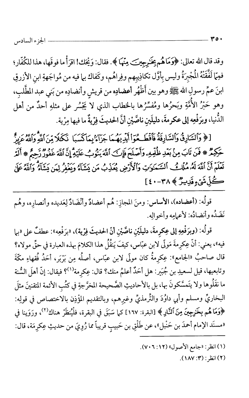 قوله: (وبرفعه إلى عكرمة، دليلين ناصين أن الحديث فرية)، "برفعه": عطف على "بما فيه"، يعني: أن عكرمة مولى لابن عباس، كيف ينقل هذا الكلام بهذه العبارة في حق مولاه؟ قال صاحب "الجامع": عكرمة كان مولى لابن عباس، أصله من بربر، أحد فقهاء مكة وتابعيها، قيل لسعيد بن جبير: هل أحد أعلم منك؟ قال: عكرمة؟ فيقال: إن أهل السنة ما نقلوها ولا يتمسكون بها، بل بالأحاديث الصحيحة المخرجة في كتب الأئمة المتقنين مثل البخاري ومسلم وأبي داود والترمذي وغيرهم، وبالتقديم المؤذن بالاختصاص في قوله: {وَمَا هُمْ بِخَارِجِينَ مِنْ النَّارِ} [البقرة: 167] كما سبق في البقرة، فلينظر هناك، وروينا في "مسند الإمام أحمد بن حنبل"، عن طلق بن حبيب قريباً مما رُوي من حديث عكرمة، قال: