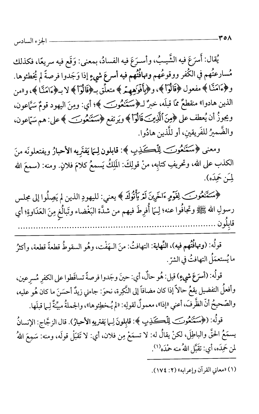 يقال: أسرع فيه الشيب، وأسرع فيه الفساد، بمعنى: وقع فيه سريعاً، فكذلك مسارعتهم في الكفر ووقوعهم وتهافتهم فيه أسرع شيءٍ إذا وجدوا فرصةً لم يخطئوها. و (آمَنَّا) مفعول (قالوا)، و (بِأَفْواهِهِمْ) متعلق بـ (قالوا) لا بـ (آمنا)، و"مِنَ الَّذِينَ هادُوا" منقطعٌ مما قبله، خبرٌ لـ (سماعون)؛ أي: ومن اليهود قومٌ سماعون، ويجوز أن يعطف على (مِنَ الَّذِينَ قالُوا) ويرتفع (سماعون) على: هم سماعون، والضمير للفريقين، أو للذين هادوا.