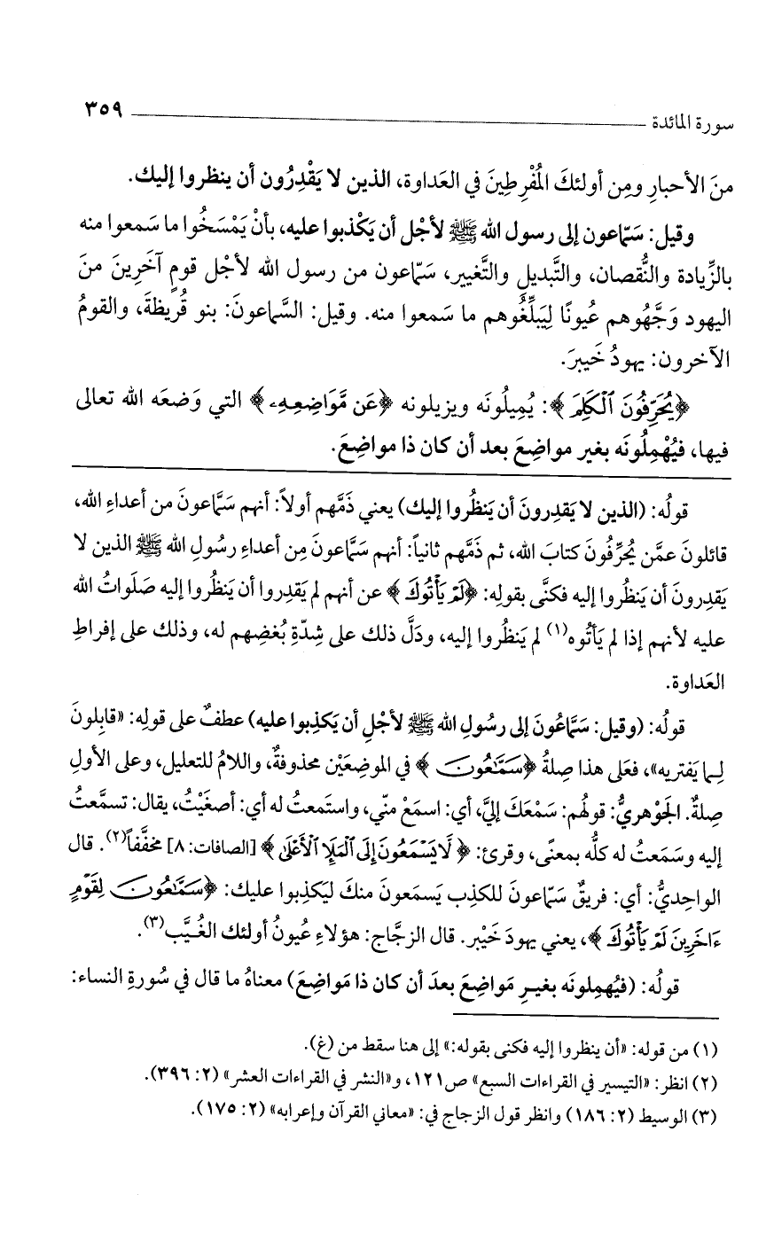 وقيل: سماعون إلى رسول اللَّه صلى اللَّه عليه وسلم لأجل أن يكذبوا عليه، بأن يمسخوا ما سمعوا منه بالزيادة والنقصان، والتبديل والتغيير، سماعون من رسول اللَّه لأجل قومٍ آخرين من اليهود وجهوهم عيوناً ليبلغوهم ما سمعوا منه. وقيل: السماعون: بنو قريظة، والقوم الآخرون: يهود خيبر.