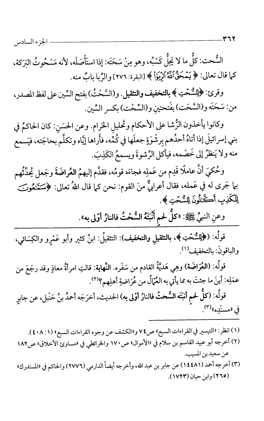 وقرئ: (لِلسُّحْتِ) بالتخفيف والتثقيل. و (السحت) بفتح السين على لفظ المصدر، من: سحته و (السحت) بفتحتين و (السحت) بكسر السين.