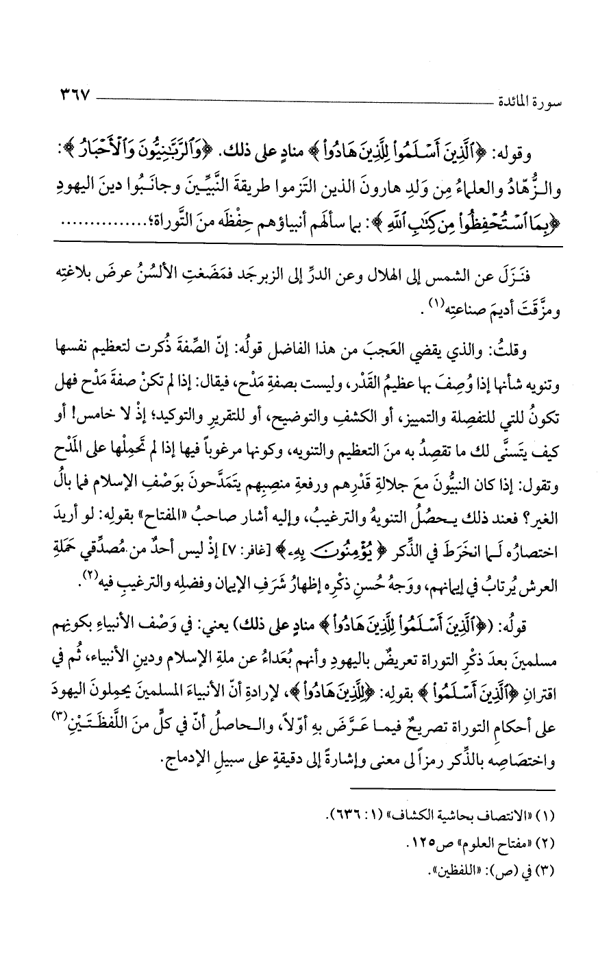 وقلت: والذي يقضي العجب من هذا الفاضل قوله: إن الصفة ذُكرت لتعظيم نفسها وتنويه شأنها إذا وُصف بها عظيم القدر، وليست بصفة مدح، فيقال: إذا لم تكن صفة مدح فهل تكون للتي للتفصلة والتمييز، أو الكشف والتوضيح، أو للتقرير والتوكيد؛ إذ لا خامس! أو كيف يتسنى لك ما تقصد به من التعظيم والتنويه، وكونها مرغوباً فيها إذا لم تحملها على المدح وتقول: إذا كان النبيون مع جلالة قدرهم ورفعة منصبهم يتمدحون بوصف الإسلام فما بال الغير؟ فعند ذلك يحصل التنويه والتغريب، وإليه أشار صاحب "المفتاح" بقوله: لو أريد اختصاره لما انخرط في الذكر {وَيُؤْمِنُونَ بِهِ} [غافر: 7] إذ ليس أحدٌ من مصدقي حملة العرش يُرتاب في إيمانهم، ووجه حسن ذكره إظهار شرف الإيمان وفضله والترغيب فيه.