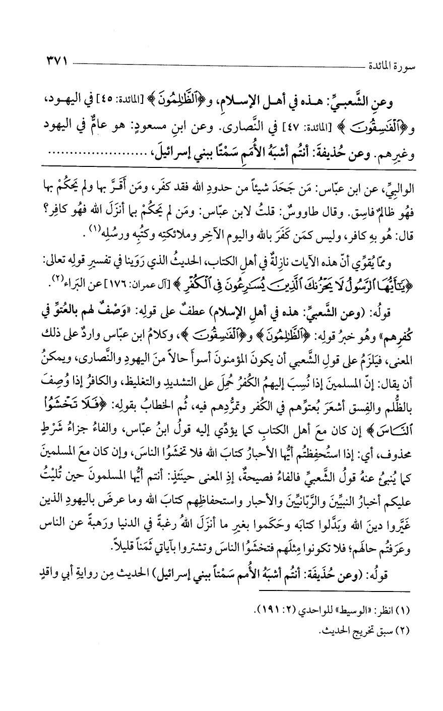 وعن الشعبي: هذه في أهل الإسلام، و (الظالمون) [المائدة: 45] في اليهود، و (الفاسقون) [المائدة: 47] في النصارى. وعن ابن مسعود: هو عام في اليهود وغيرهم. وعن حذيفة: أنتم أشبه الأمم سمتاً ببني إسرائيل، ...